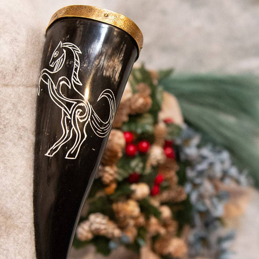 Engraved Viking Drinking Horn with Brass Decorations and a Horse Carving