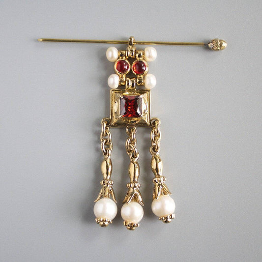 Renaissance Brooch with 4 Pearls a Red Glass Pendant