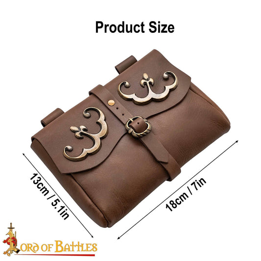 15th Century Brown Pouch with Antique Brass Fleur de Lys Mounts