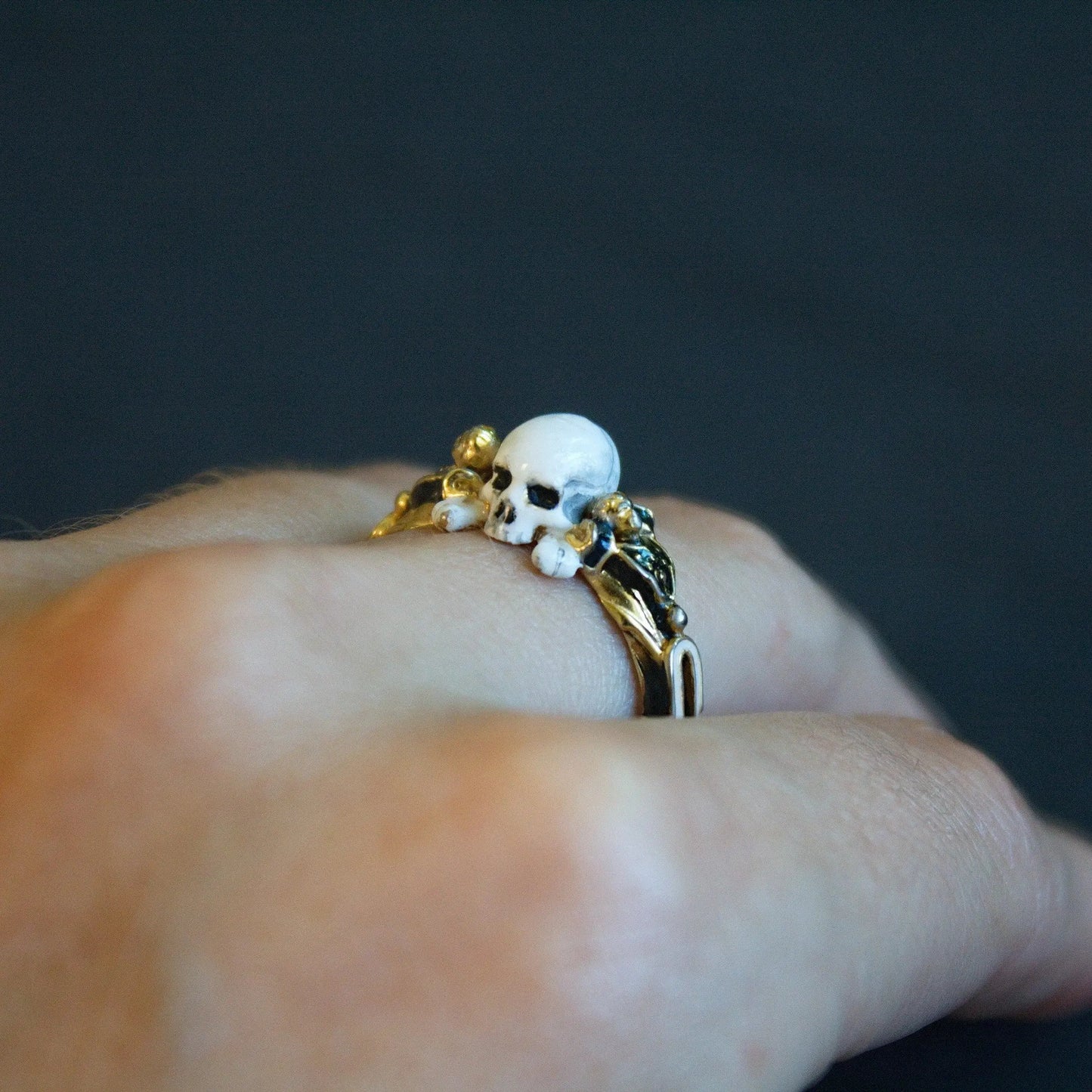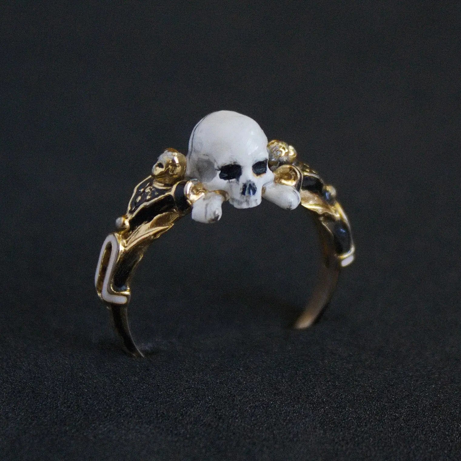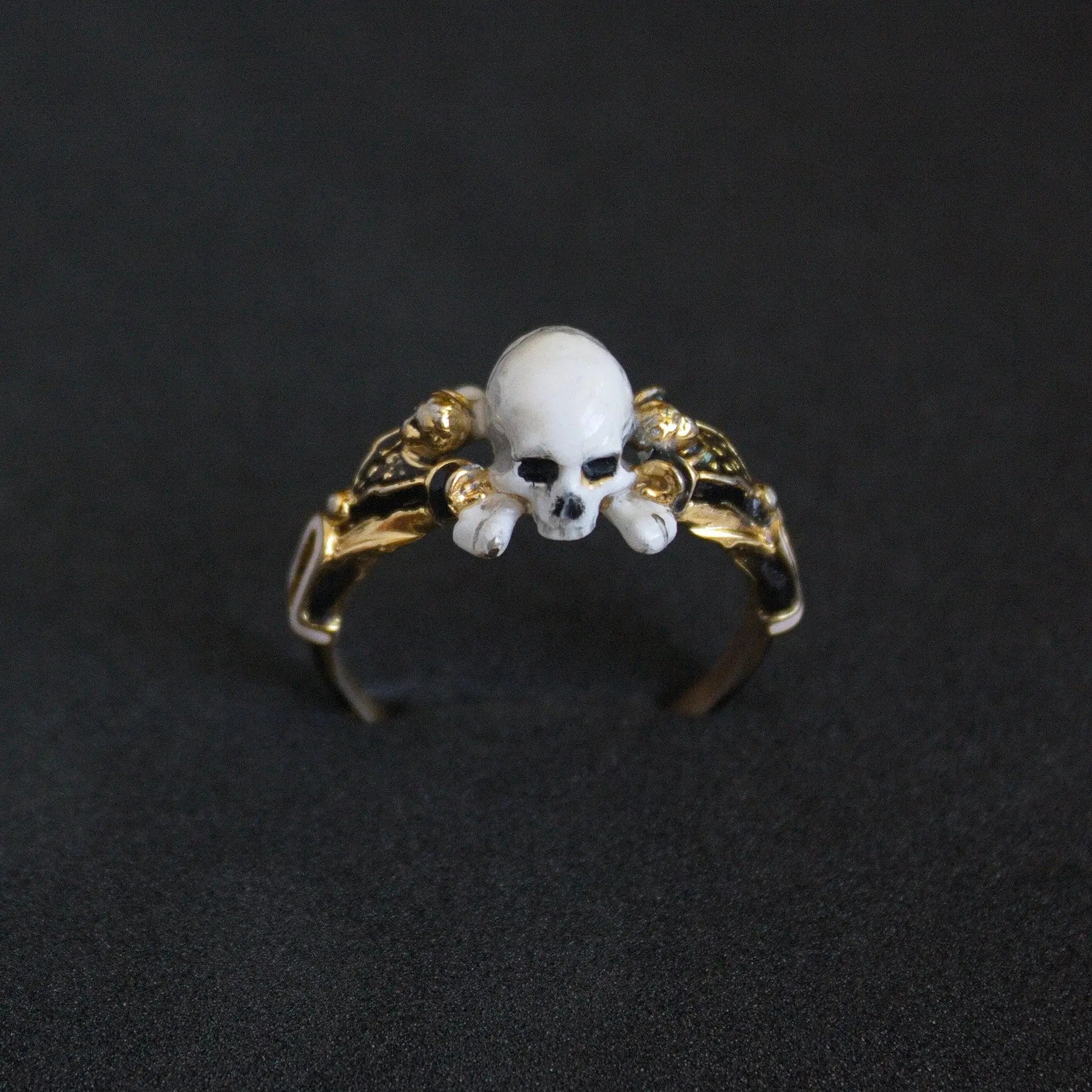 Replica of a memento mori ring from the 1600s, currently found at the Museo Poldi Pezzoli. In the center rests a 3 dimensional skull missing its lower jaw, while two crossed tibiae lie beneath. This design is an example of the medieval motif that symbolizes the impermanence of life. This particular piece, crafted in the early 17th century, showcases a typically Nordic style although this piece is from Venice.