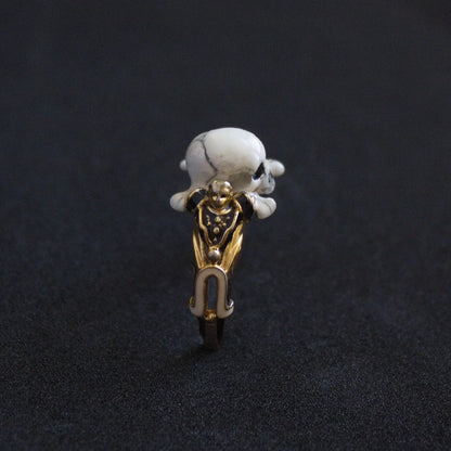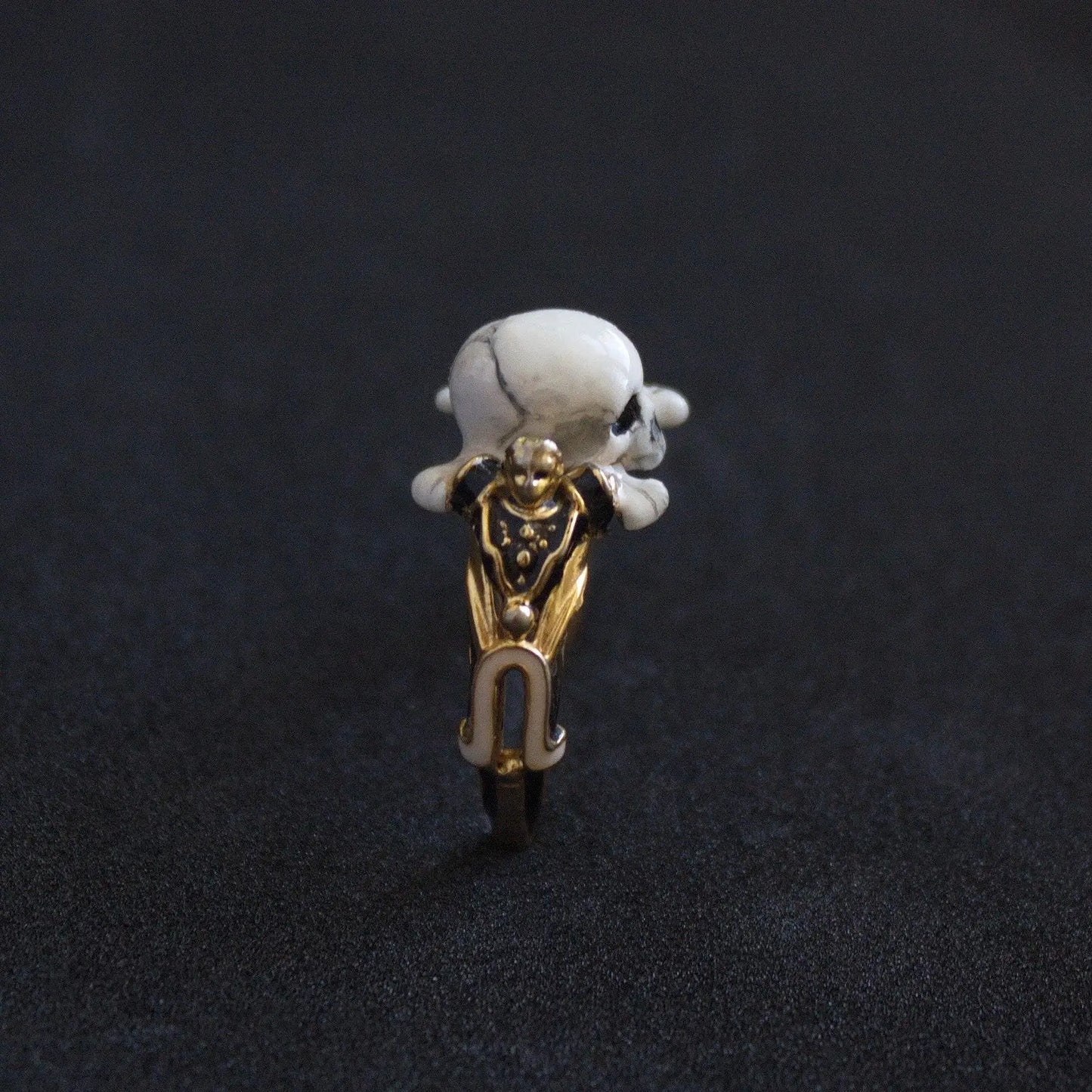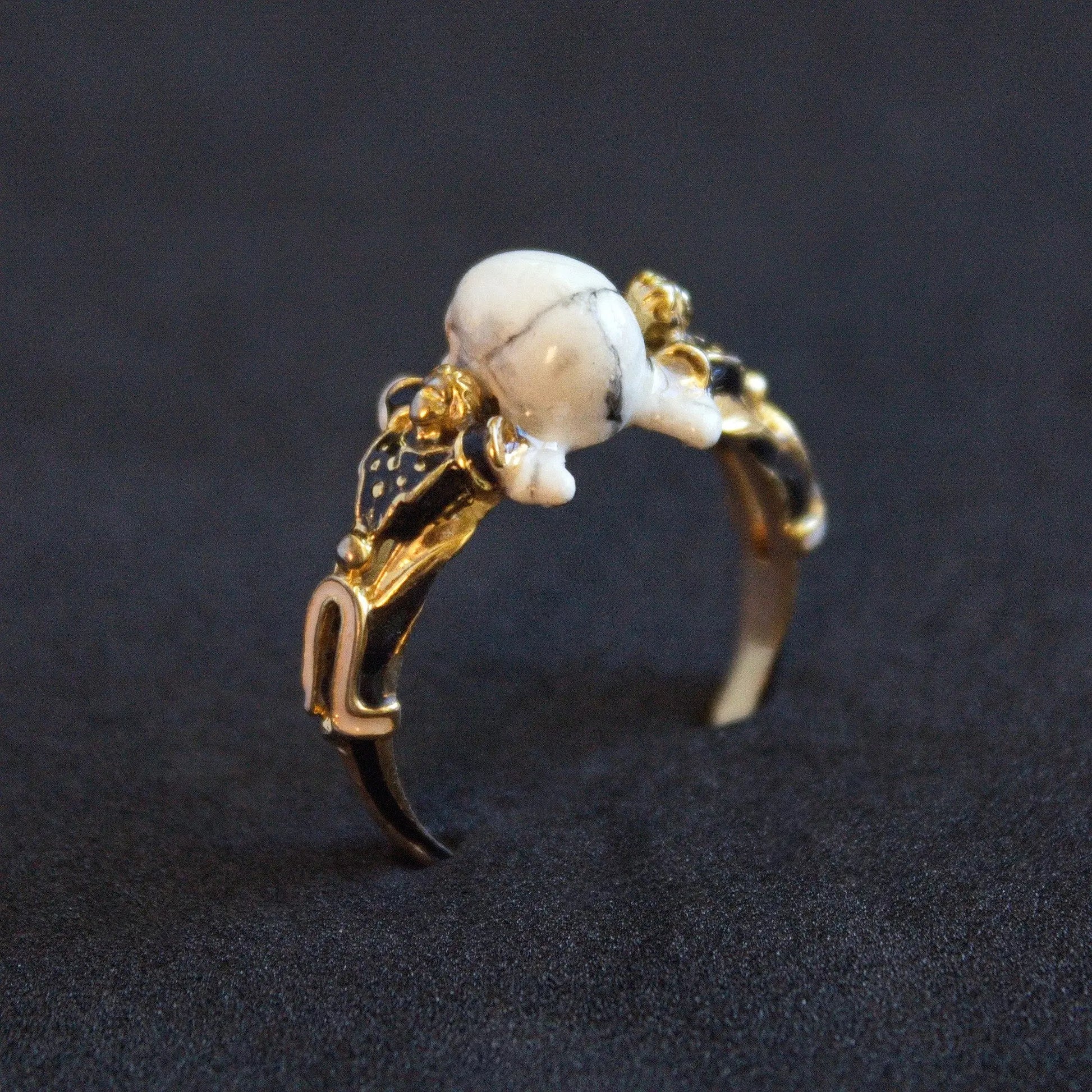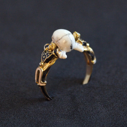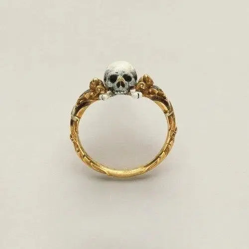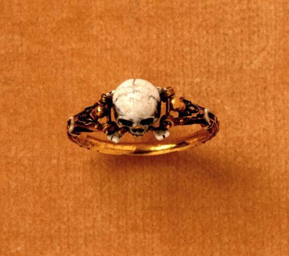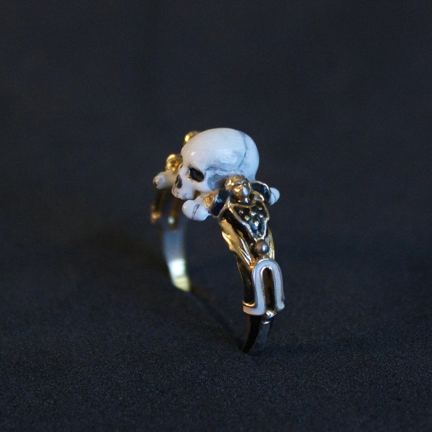Replica of a memento mori ring from the 1600s, currently found at the Museo Poldi Pezzoli. In the center rests a 3 dimensional skull missing its lower jaw, while two crossed tibiae lie beneath. This design is an example of the medieval motif that symbolizes the impermanence of life. This particular piece, crafted in the early 17th century, showcases a typically Nordic style although this piece is from Venice.