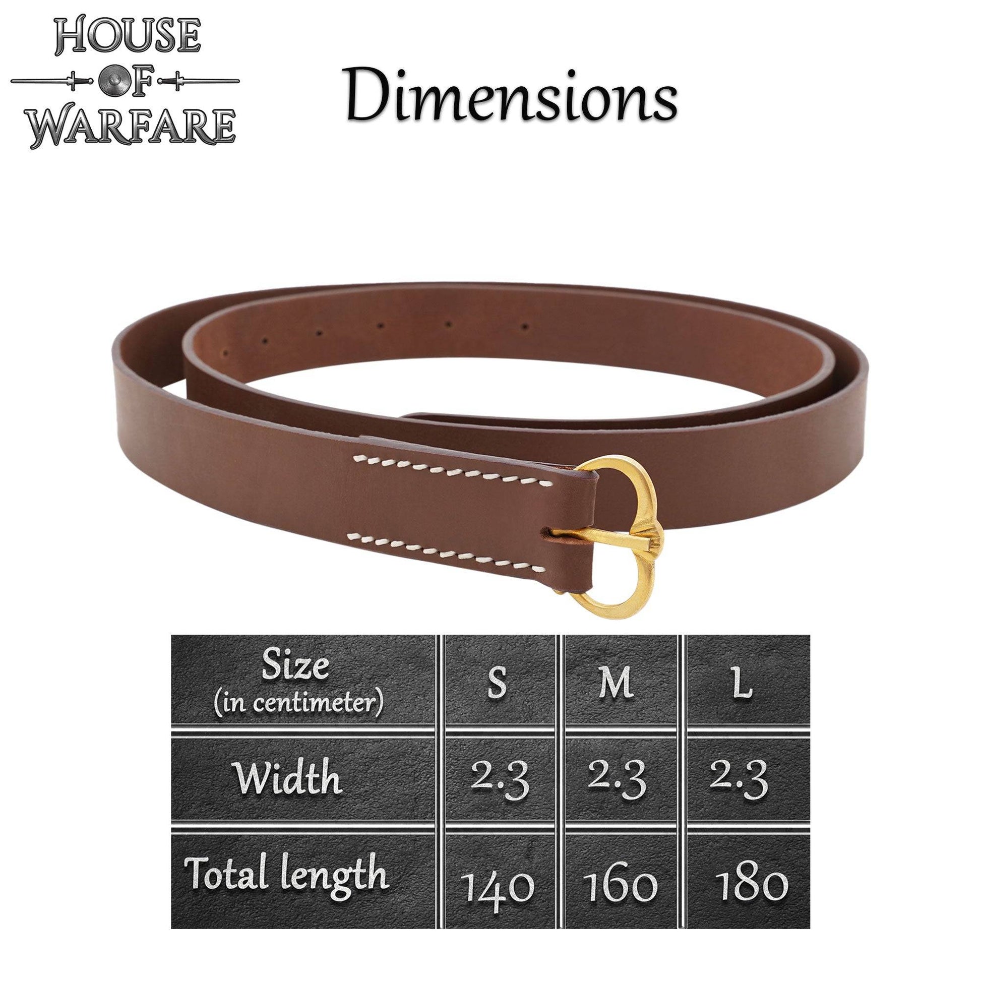 Cette ceinture médiévale simple comporte une réplique de boucle du 14e au 5e siècle. Fabriquée à partir de cuir marron foncé durable et solidement cousue, cette ceinture est un accessoire de reconstitution parfait. Il est orné d'une réplique de boucle en laiton aux détails authentiques qui comporte un petit feston sous l'épingle.