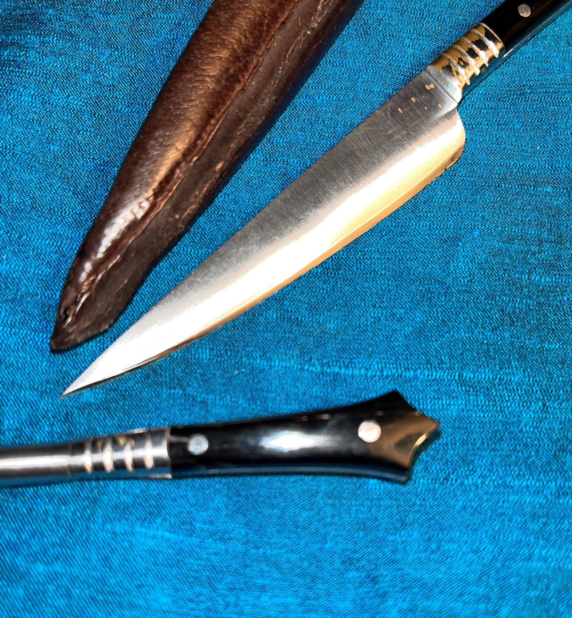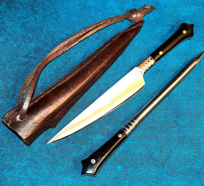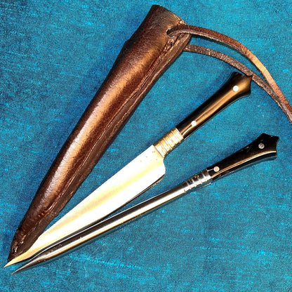 Couverts médiévaux 2 pièces dans un fourreau - Couteau et piqueur, os, corne, manche en bois