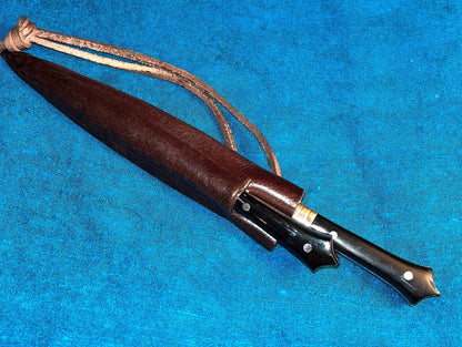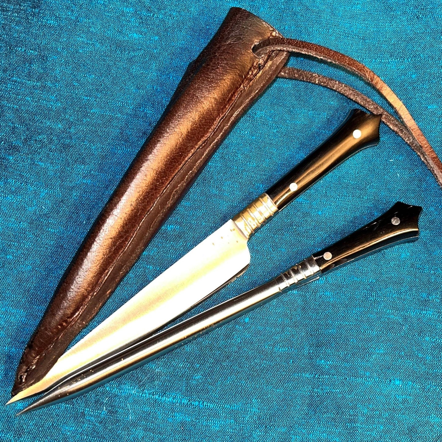 Il s'agit de notre ensemble de couverts en deux pièces qui comprend un couteau et un piqueur, avec un étui en cuir marron foncé assorti. Pendant la majeure partie de la période médiévale, les fourchettes n'étaient pas utilisées, certains individus utilisaient à la place un piqueur (bien que la plupart se contentaient d'une cuillère et d'un couteau). Il s'agit d'un ensemble de taille standard, idéal pour être porté à la ceinture.