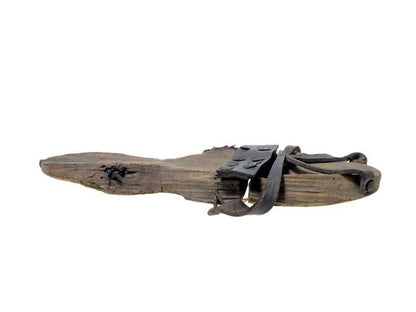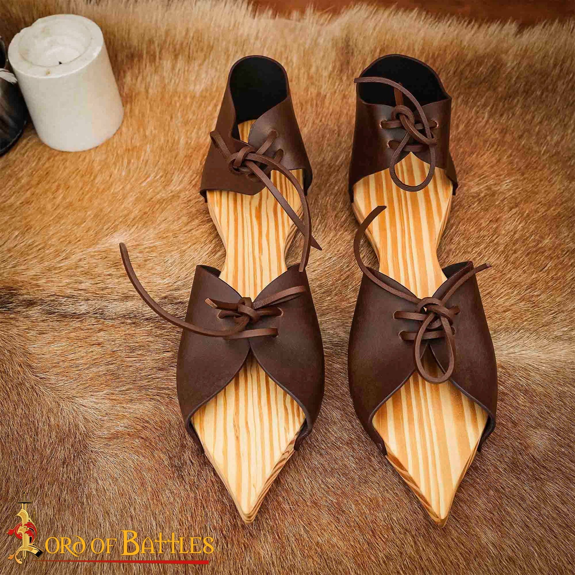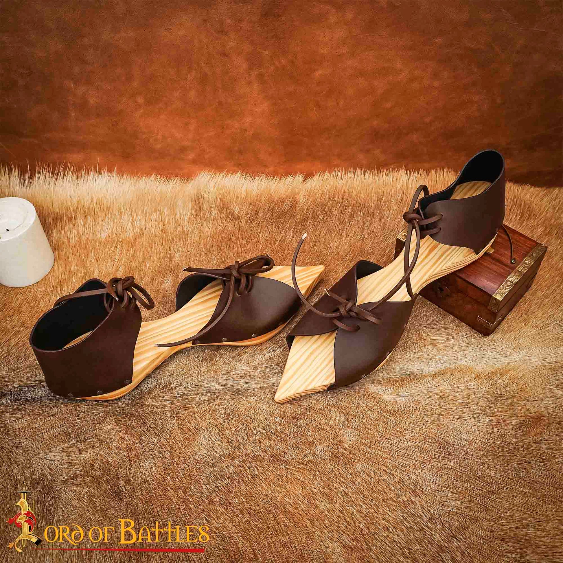 Ces modèles en bois et en cuir sont dotés d'un dessus en cuir véritable, de tailles réglables et de liens autour de la cheville et des orteils. Les semelles en bois joliment rayées et le cuir marron foncé en font un ajout élégant à toute garde-robe médiévale. Parfait pour protéger vos chaussures en cuir de la boue. Portez-les en toute confiance, sachant que vous êtes habillé avec style pour toute occasion médiévale.