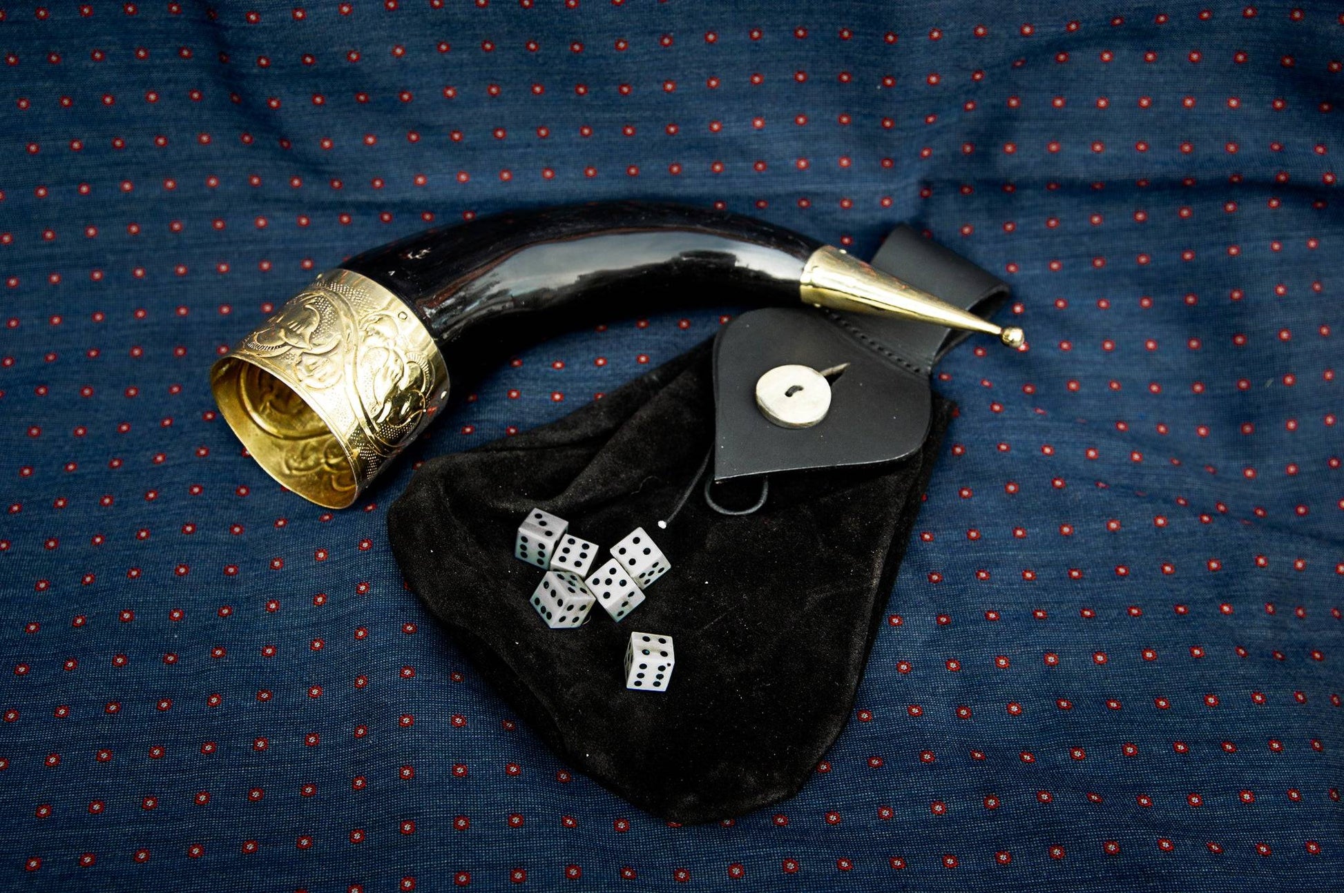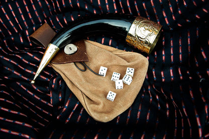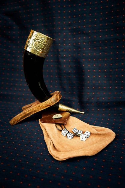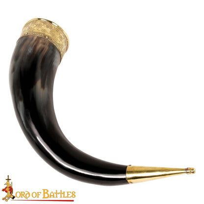 Chaque corne brille d'une belle couleur noire rehaussée de décorations en laiton délicatement estampillées. De grandes bordures en laiton et autres métaux précieux étaient souvent utilisées pour décorer les cornes à l'époque viking.