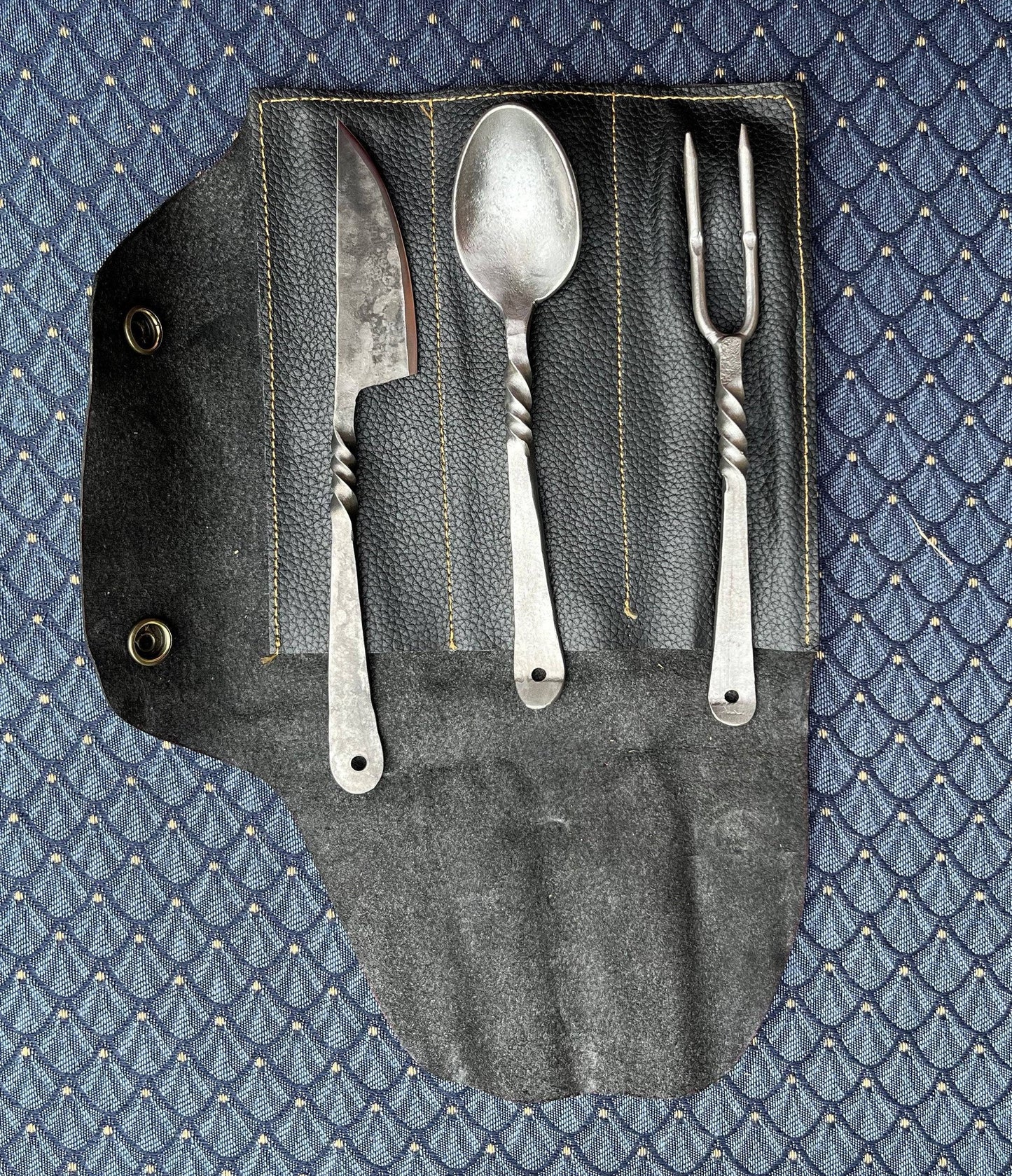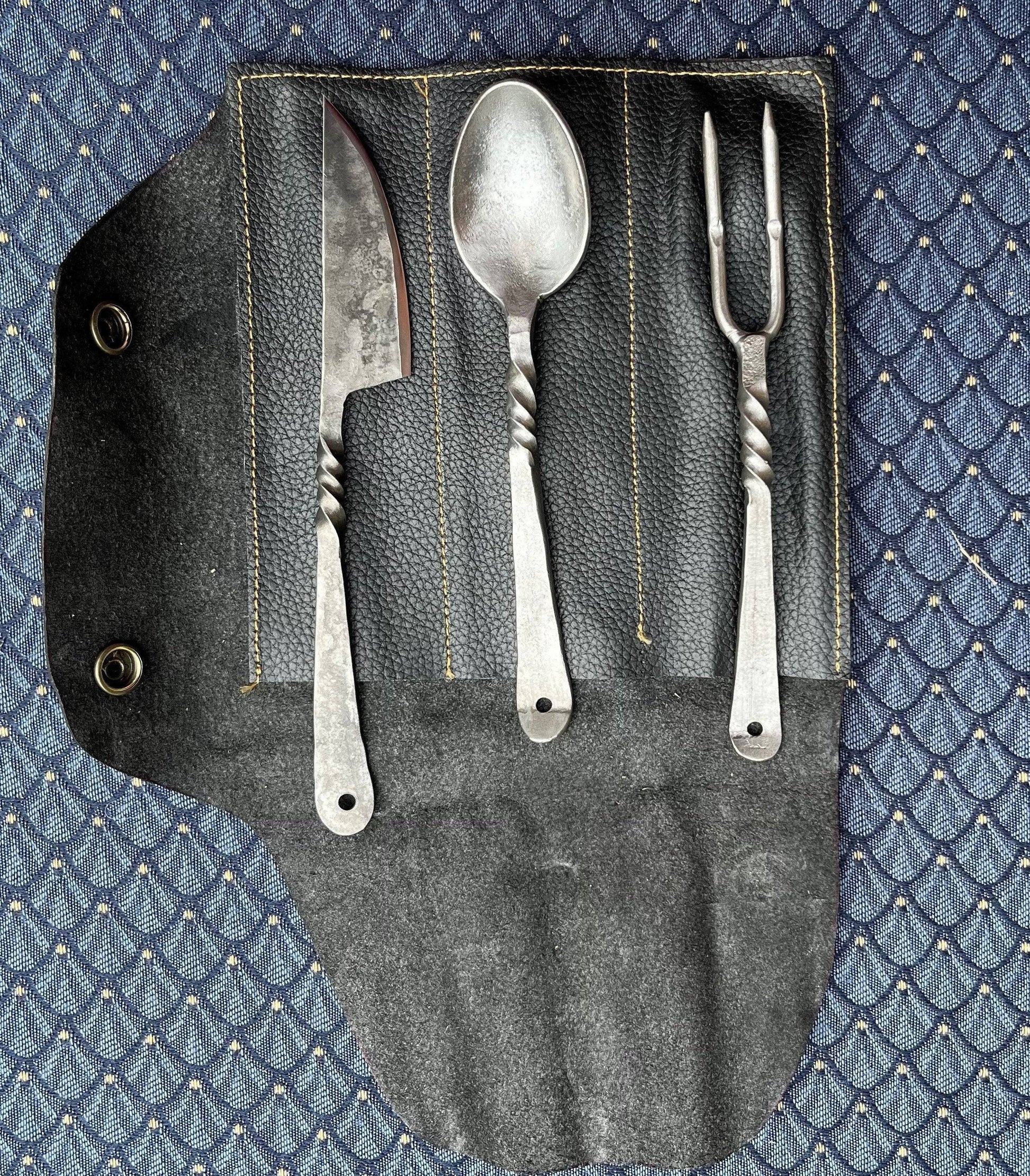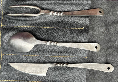 Un ensemble de couverts en trois pièces comprenant un couteau, une fourchette, une cuillère et un étui enroulable en cuir assorti.