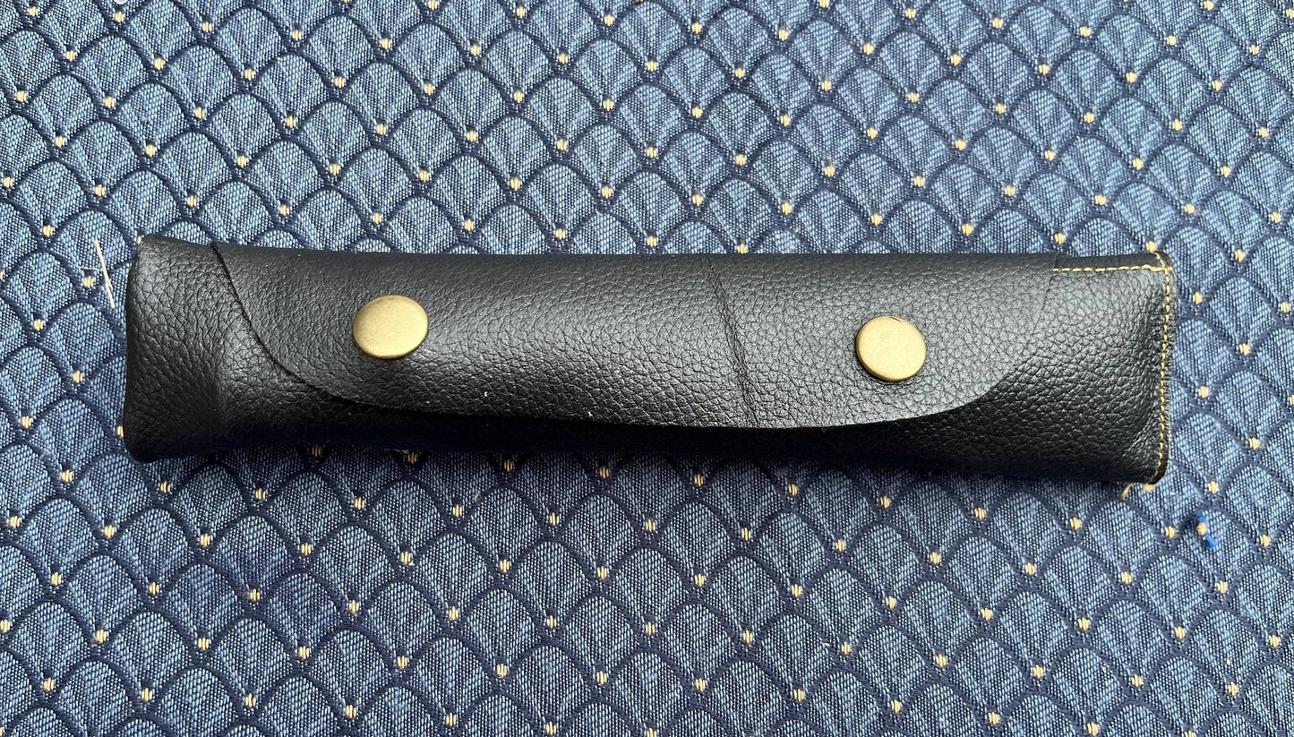 Ceux-ci sont fabriqués en fer forgé et ont une finition gris terne. Chaque poignée a une torsion décorative et un trou à l'extrémité pour faciliter la suspension ou le rangement. Le boîtier est en cuir noir avec des coutures beiges. Il se ferme avec deux rivets modernes en laiton pour une fermeture facile.