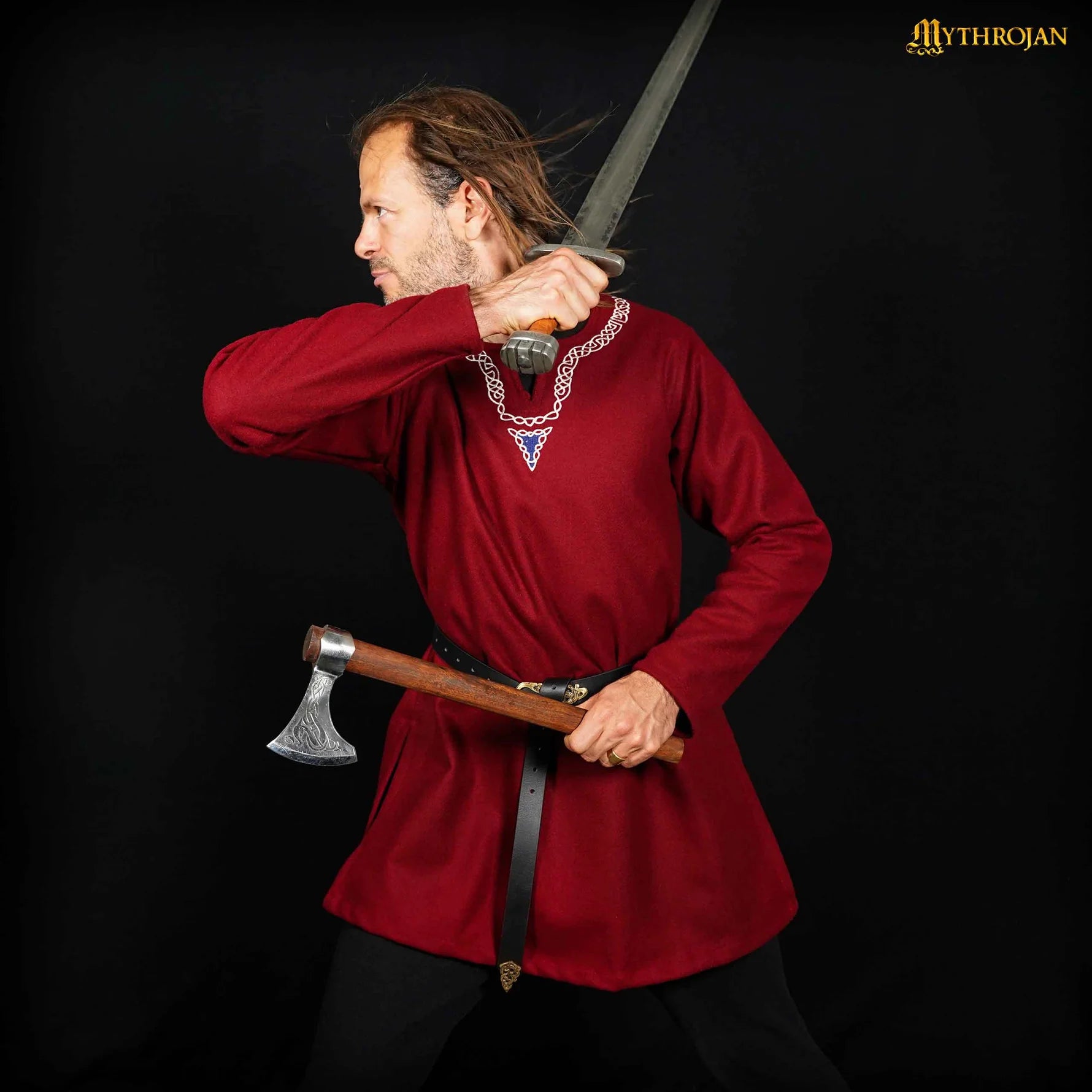 Experience the durability and elegance of our richly embroidered wool tunic, crafted for a lifetime of wear. Made from high-quality wool with intricate embroidery, it offers a comfortable fit suitable for a wide range of medieval roles—from commanding warlords to graceful shield-maidens. Perfect for medieval reenactments, SCA events, weddings, cosplay, or LARP, this tunic combines authentic style with amazing comfort in all kinds of weather.