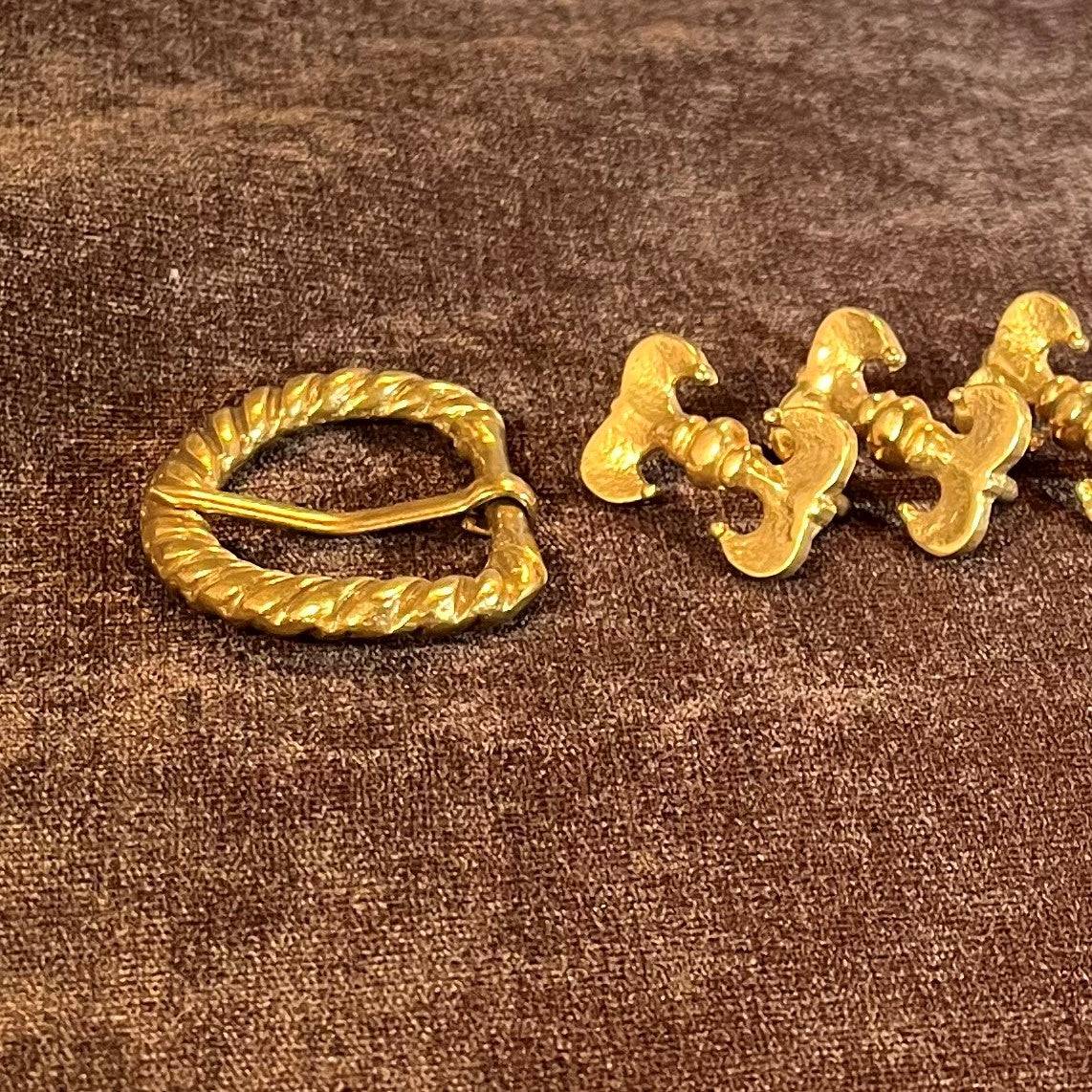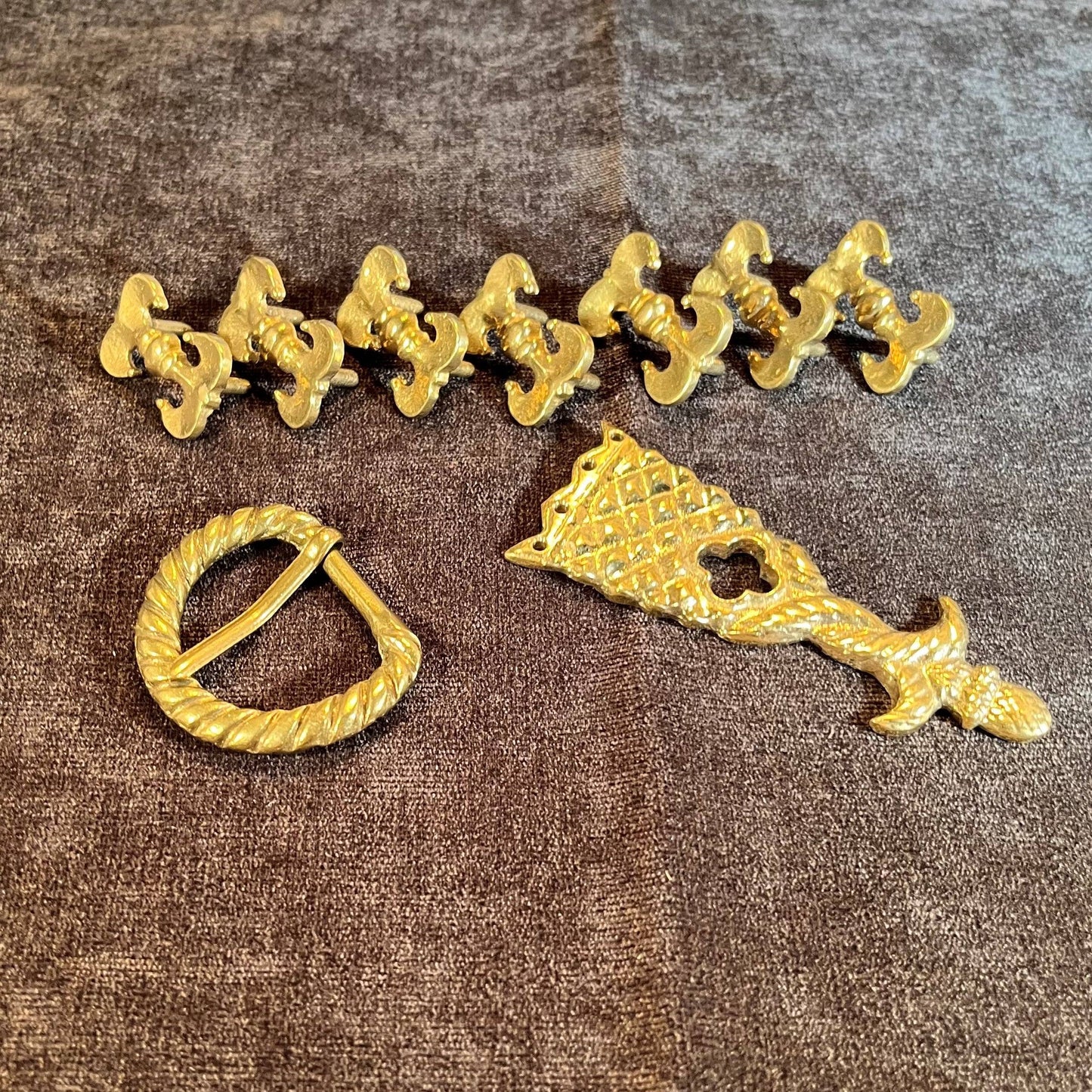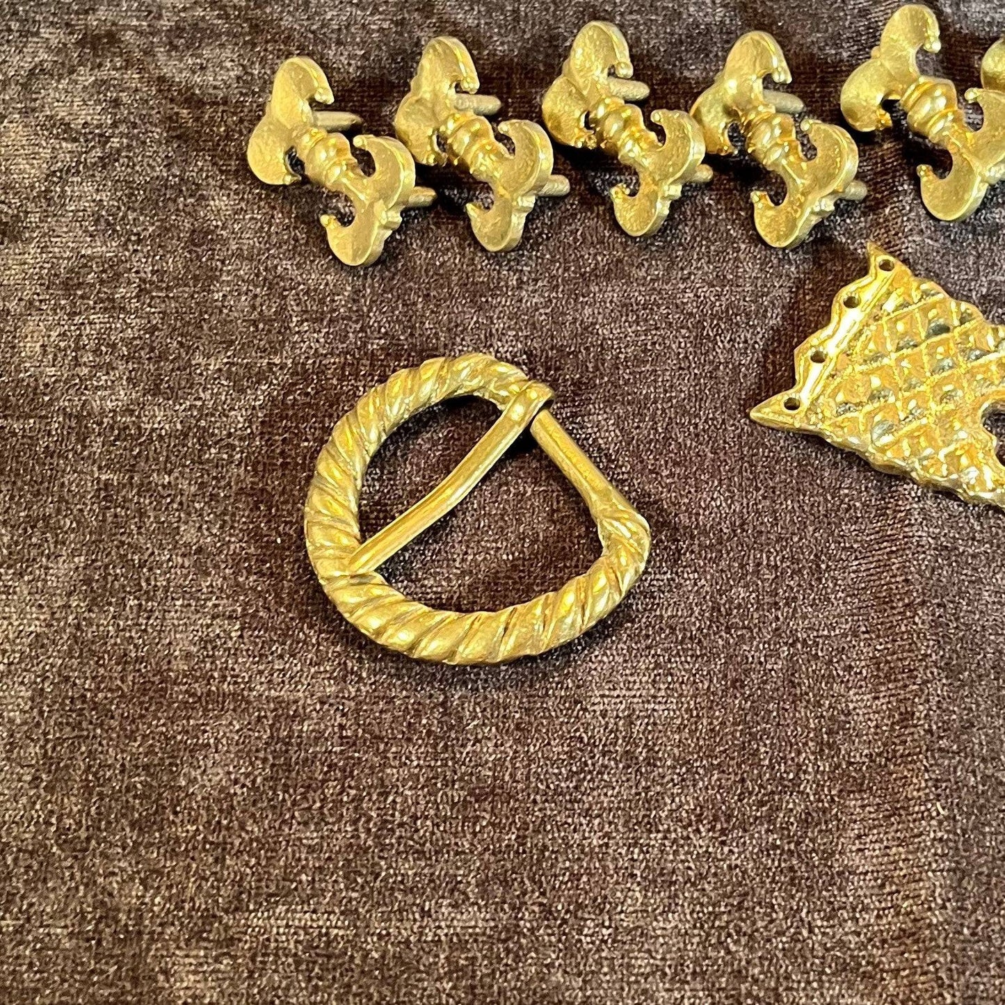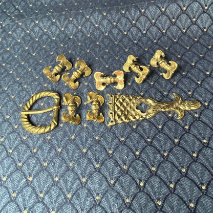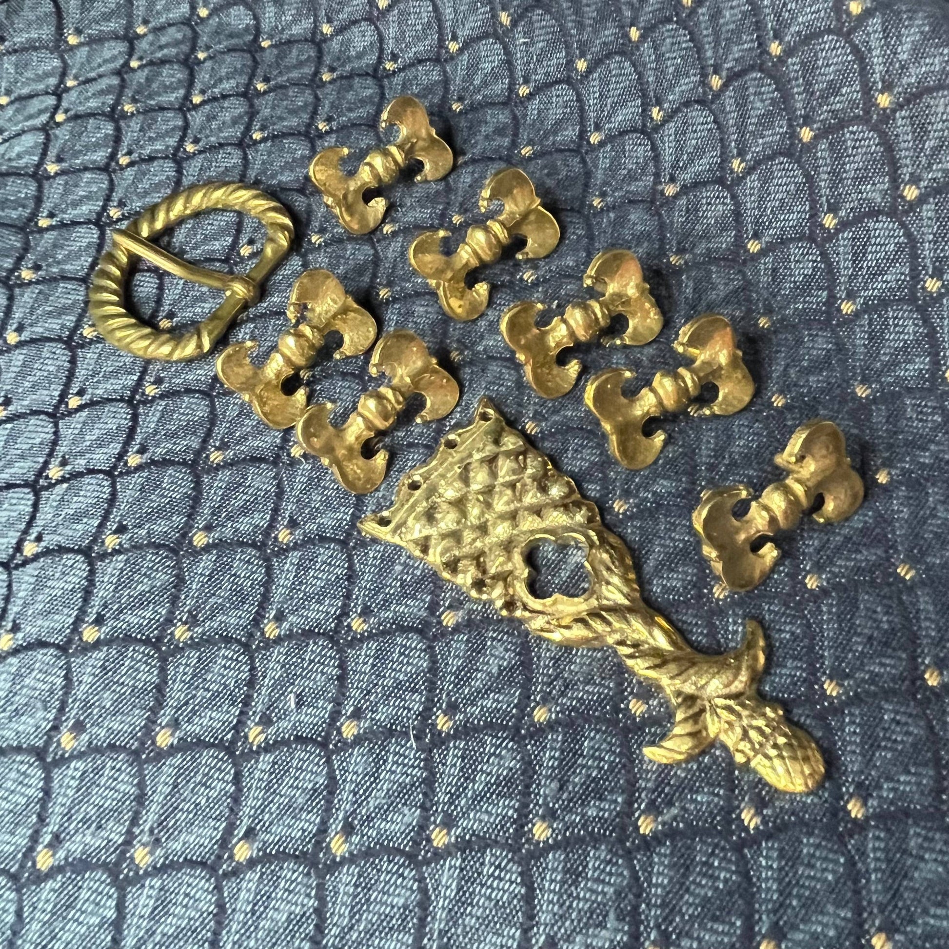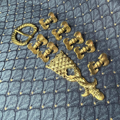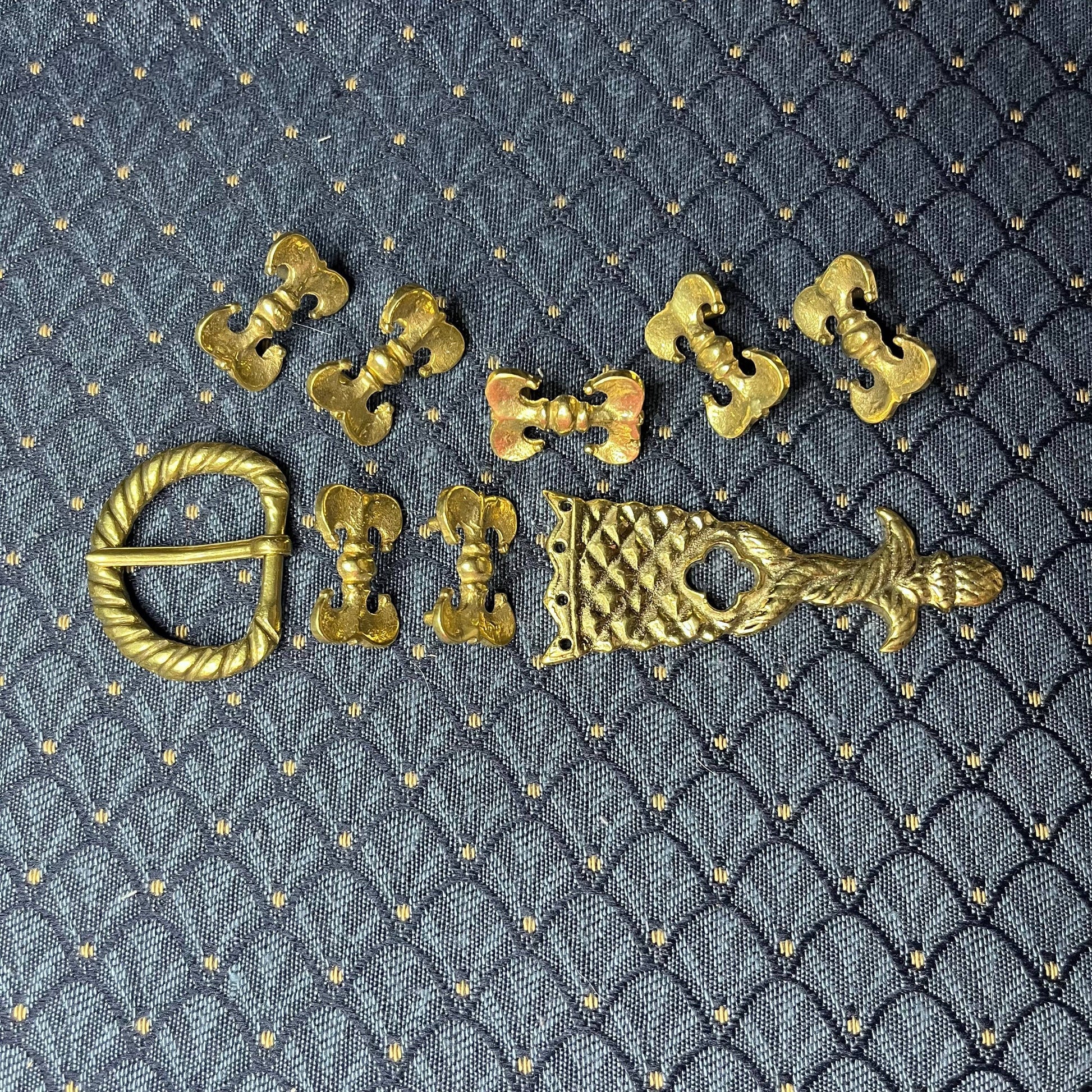 This Holiday Belt Bundle is ideal for medieval reenactors interested in the 14th century. It features a solid brass buckle with twisted design, a strap end tipped with a tiny acorn, and 8 belt fittings styled as a fleur-de-lys. Crafted for durability, it measures 3 cm (1 1/4 inch) wide, and makes for a perfect gift that provides the crafter hours of fun.