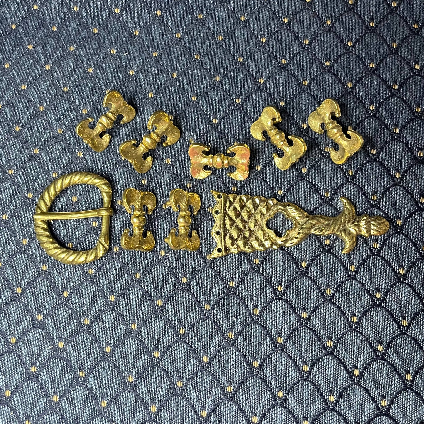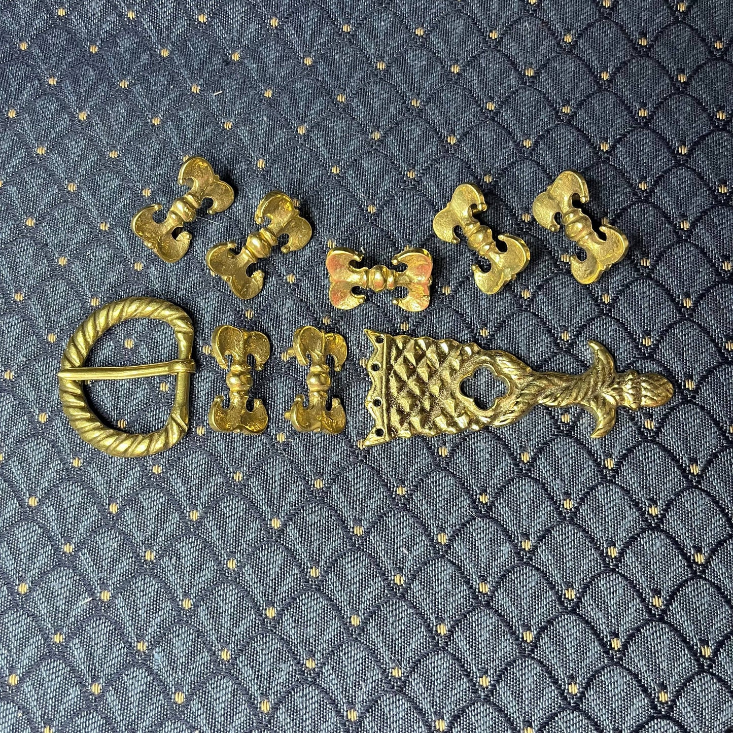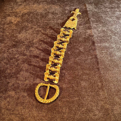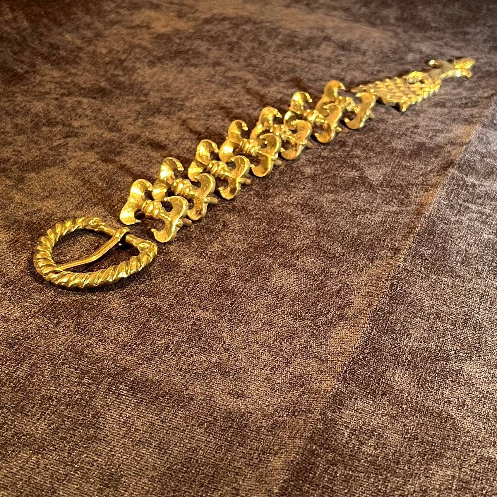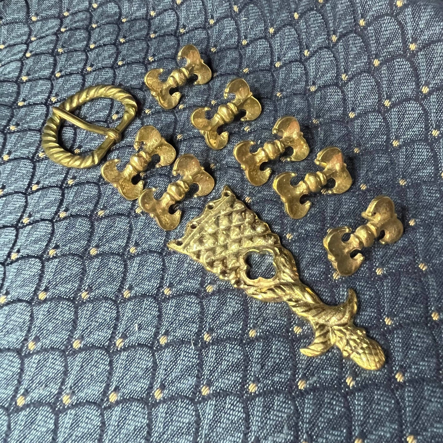 This Holiday Belt Bundle is ideal for medieval reenactors interested in the 14th century. It features a solid brass buckle with twisted design, a strap end tipped with a tiny acorn, and 8 belt fittings styled as a fleur-de-lys. Crafted for durability, it measures 3 cm (1 1/4 inch) wide, and makes for a perfect gift that provides the crafter hours of fun.