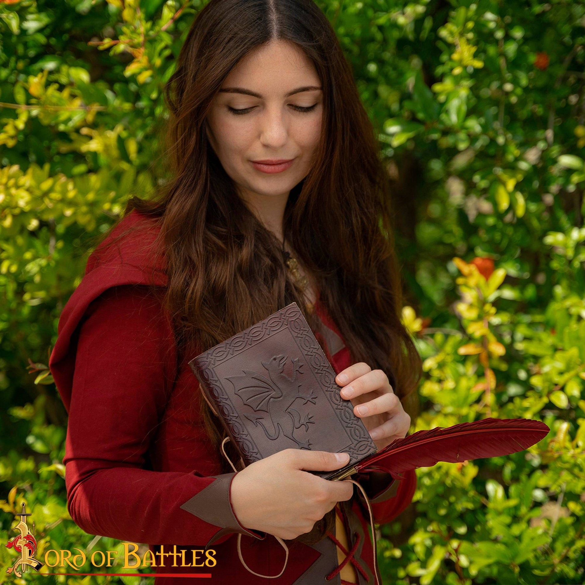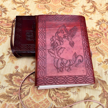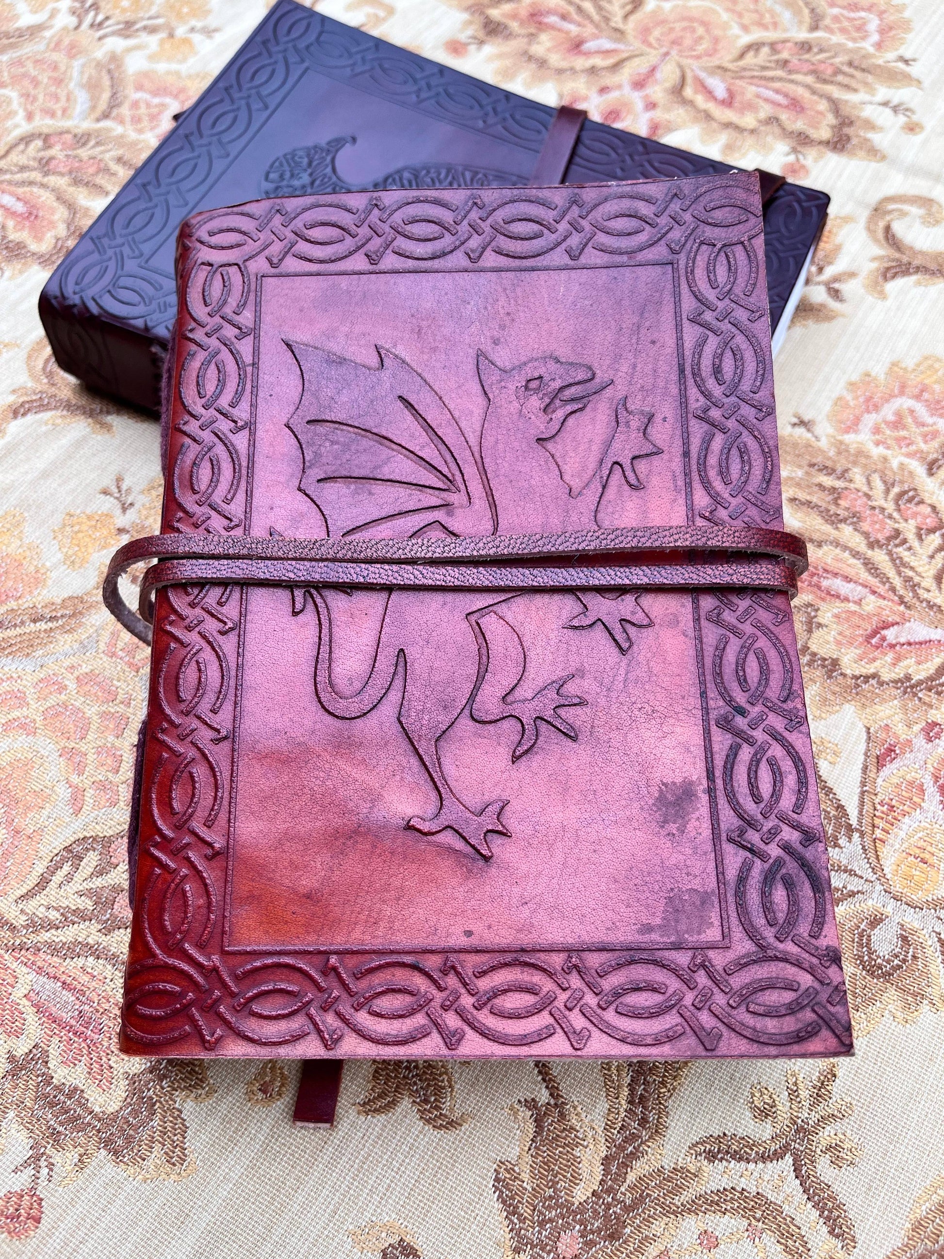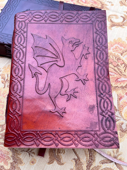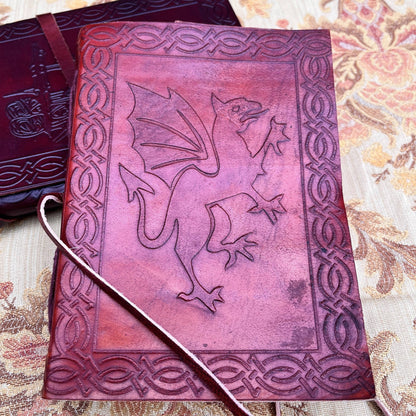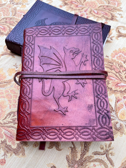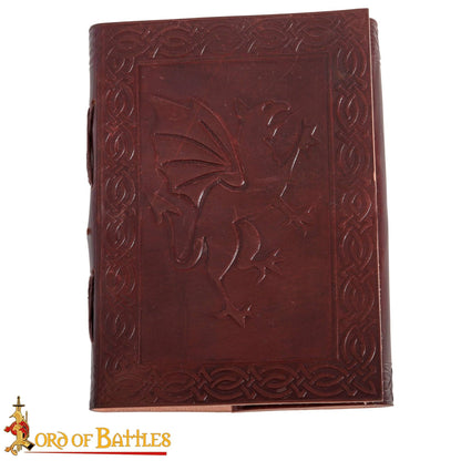 This Rearing Gryphon Journal is crafted using dark red leather with an embossed gryphon adorning the cover. Its smooth cotton pages provide an ideal writing surface, and its handcrafted construction ensures a luxurious writing experience.