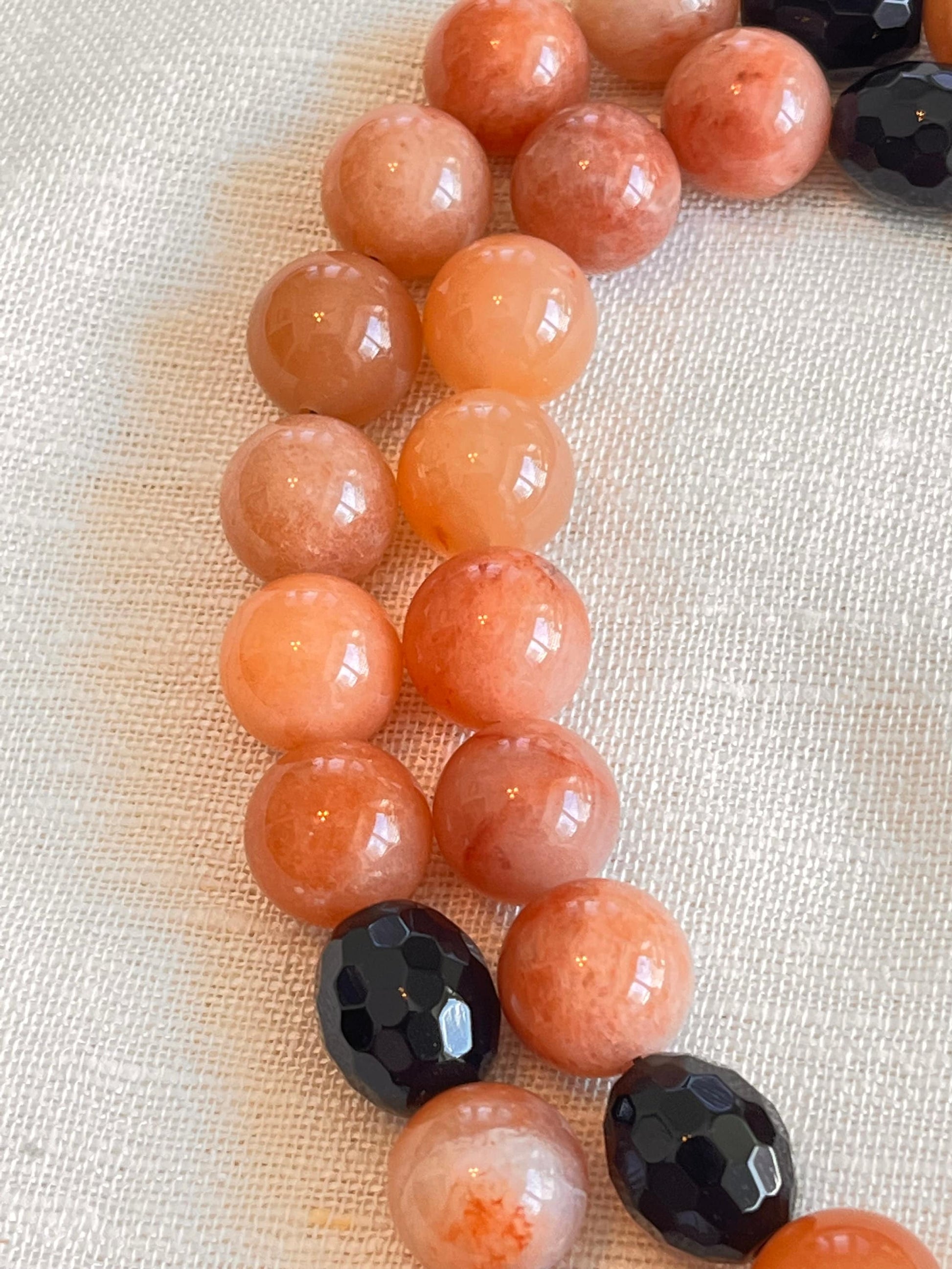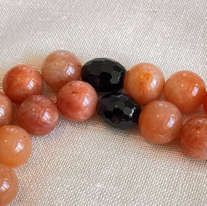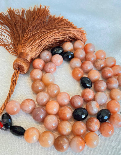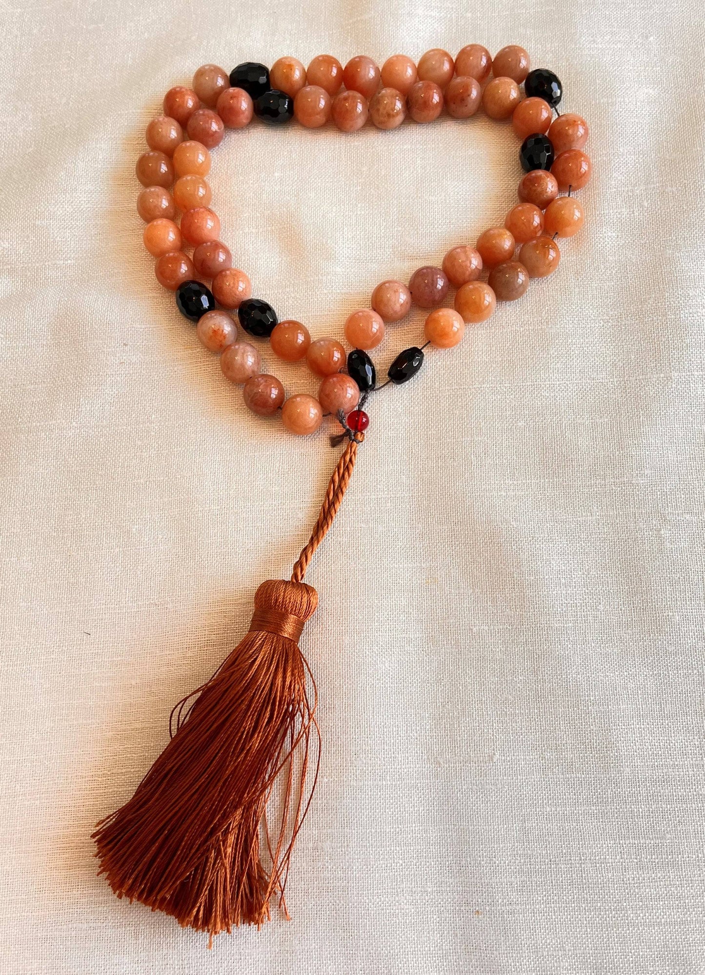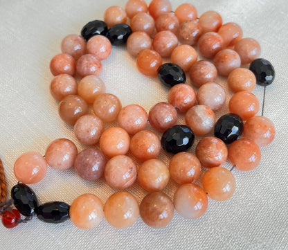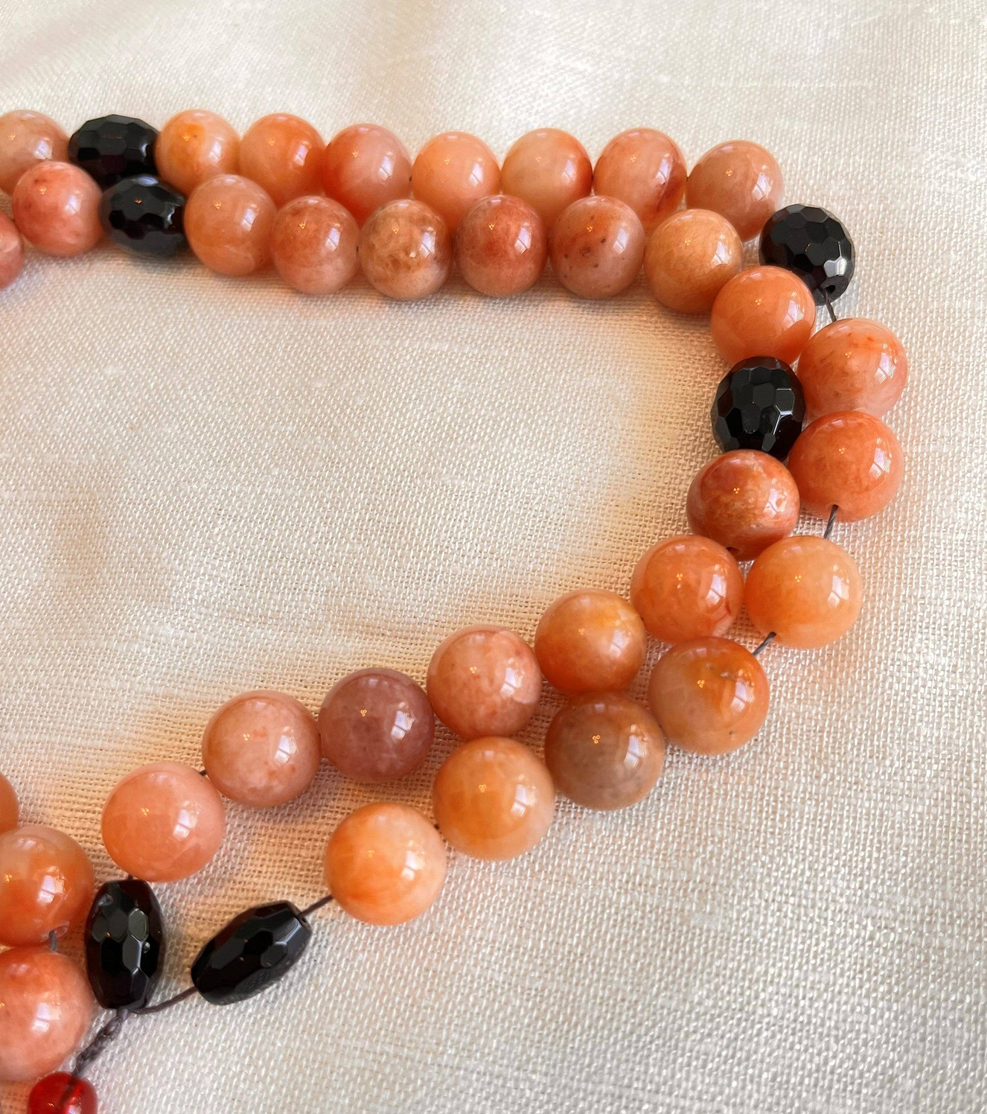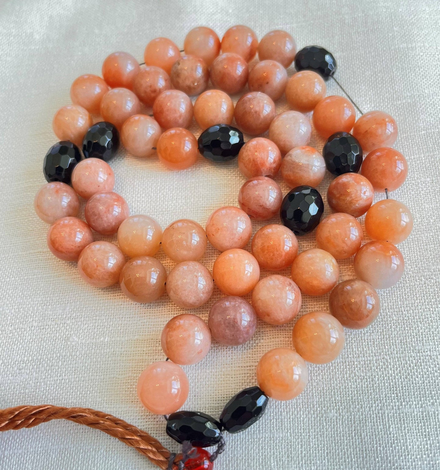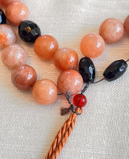 This paternoster has seven sets of 7 dark peach beads and 8 gauds of faceted black agate. Because this is a natural product each bead is unique and they can include some small irregularities (as shown in the close up pictures). It is completed with a synthetic tassel in bronze. Like real paternosters created in the medieval period, the string is a little bit longer than the beads so that they can be manipulated along its length.