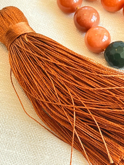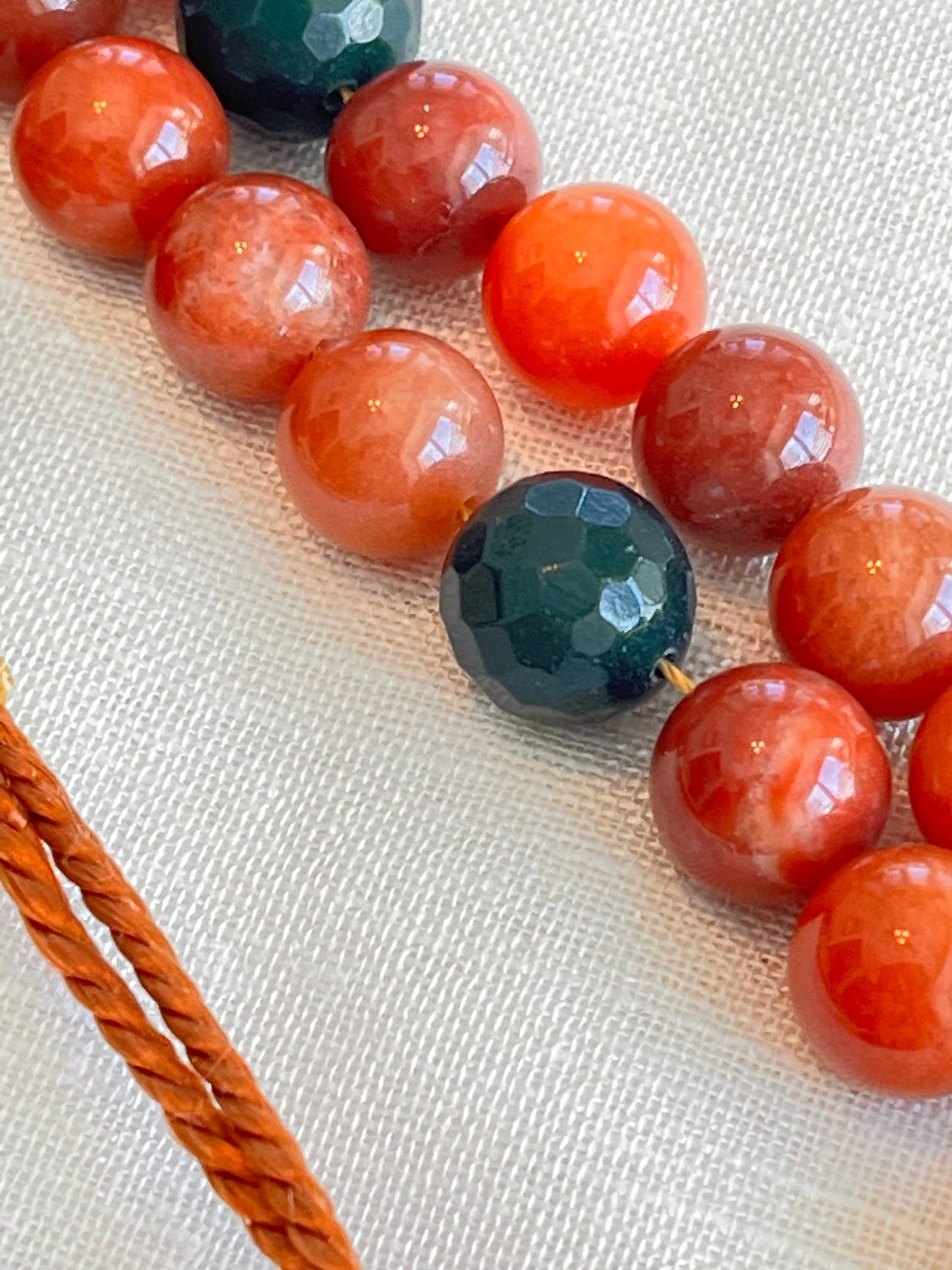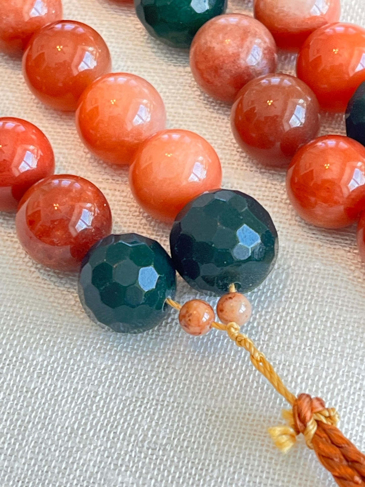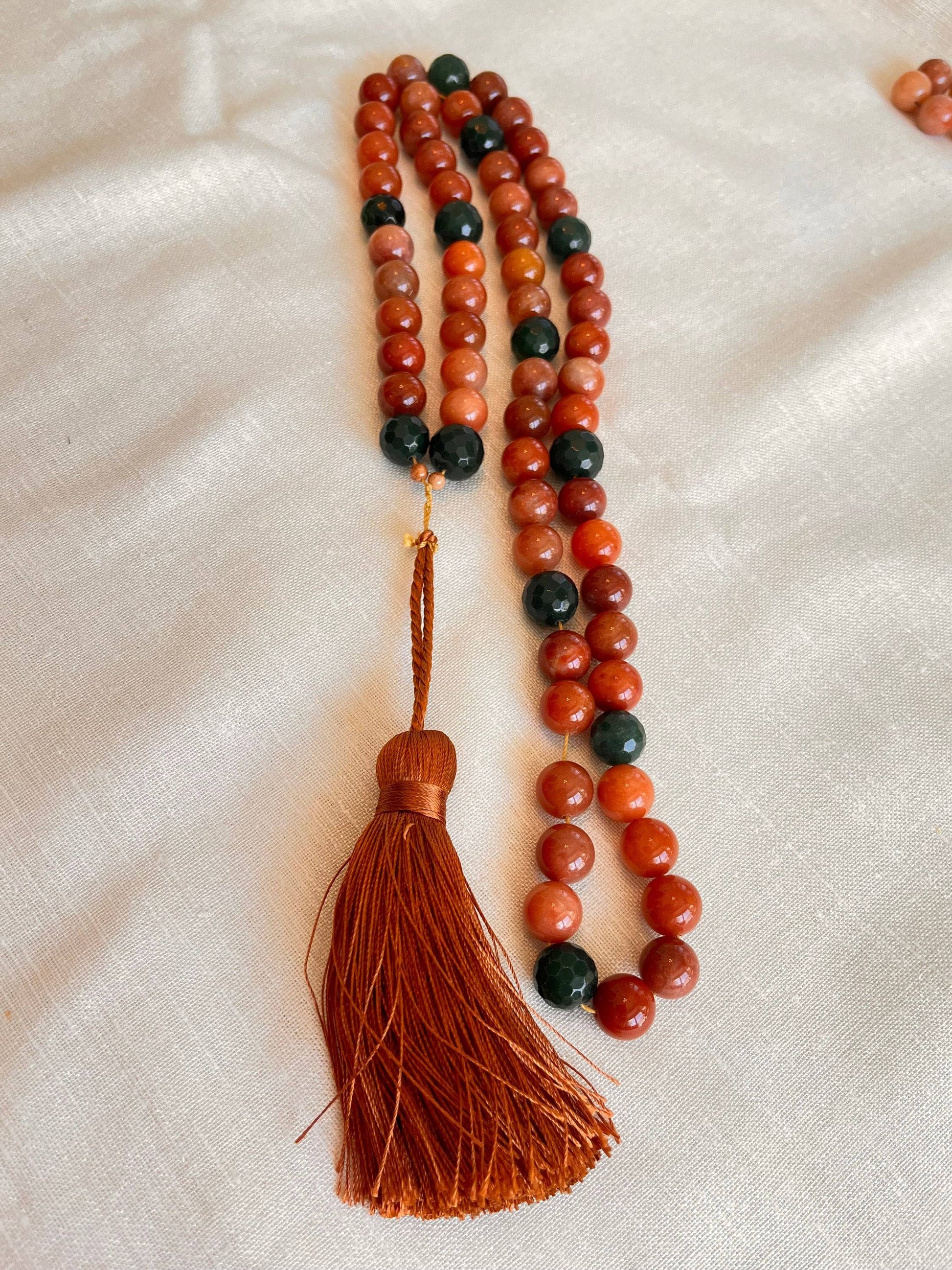 Paternosters are the medieval version of the modern rosary. Unlike modern rosaries, paternosters could have various numbers of beads. This paternoster has eleven sets of 5 dark peach beads and 12 gauds of faceted dark green agate. Because this is a natural product each bead is unique and they can include some small irregularities (as shown in the close up pictures). It is completed with a synthetic tassel in bronze. Like real paternosters created in the medieval period, the string is a little bit longer than the beads so that they can be manipulated along its length.