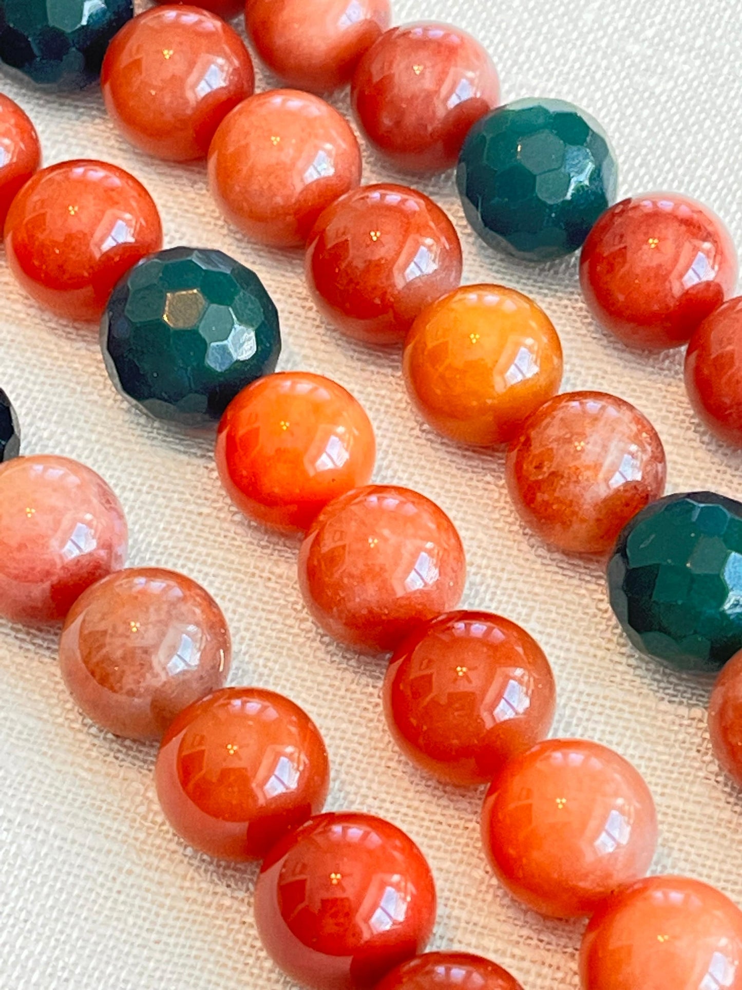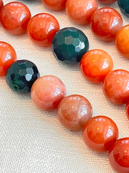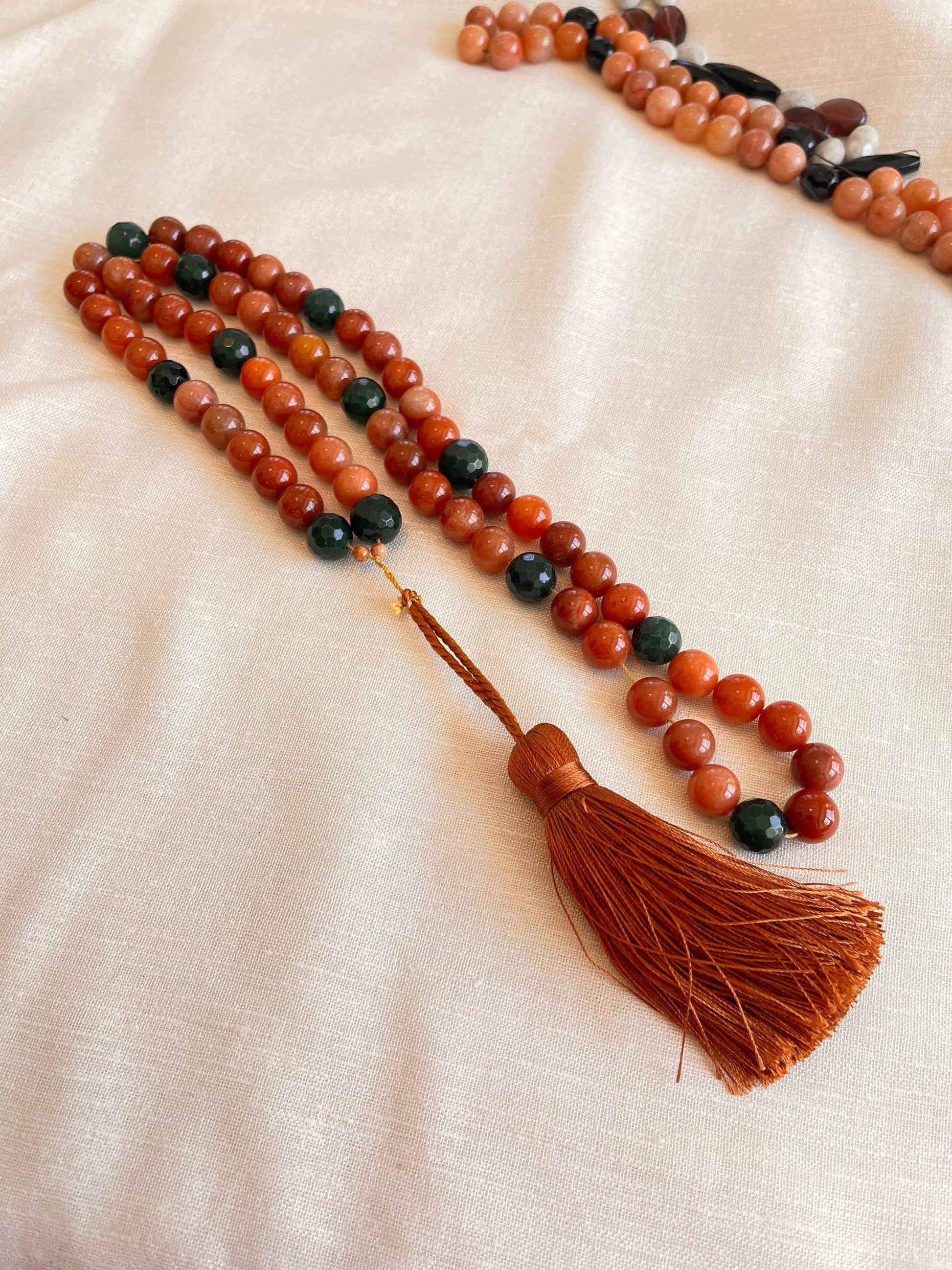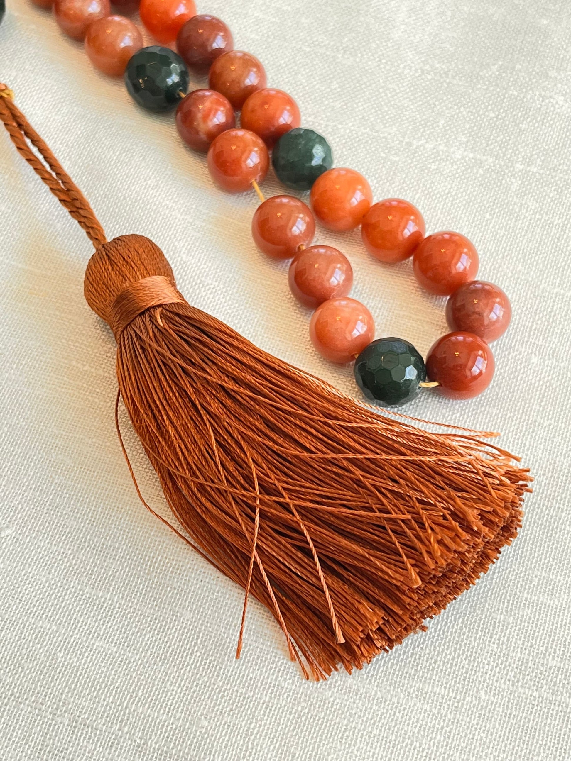 Paternosters are the medieval version of the modern rosary. Unlike modern rosaries, paternosters could have various numbers of beads. This paternoster has eleven sets of 5 dark peach beads and 12 gauds of faceted dark green agate. Because this is a natural product each bead is unique and they can include some small irregularities (as shown in the close up pictures). It is completed with a synthetic tassel in bronze. Like real paternosters created in the medieval period, the string is a little bit longer than the beads so that they can be manipulated along its length.