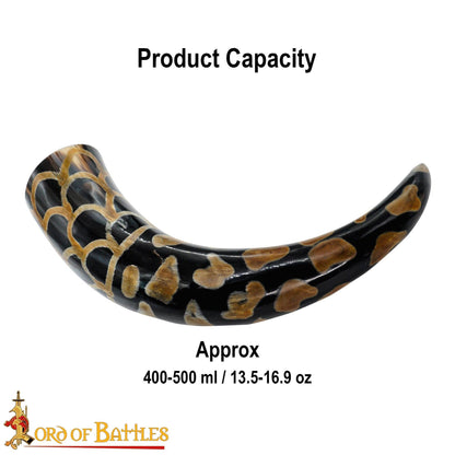 This drinking horn is handmade from genuine ox horn. The total capacity of the horn is approximately 400-500 ml.