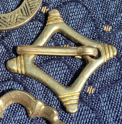 These beautiful bronze lozenge brooches are a style that dates from 1250-1400. This form of brooch was found in Northern Europe and Eastern Europe. It's small size is perfect for decorating a hat or holding the neck of a tunic together.
