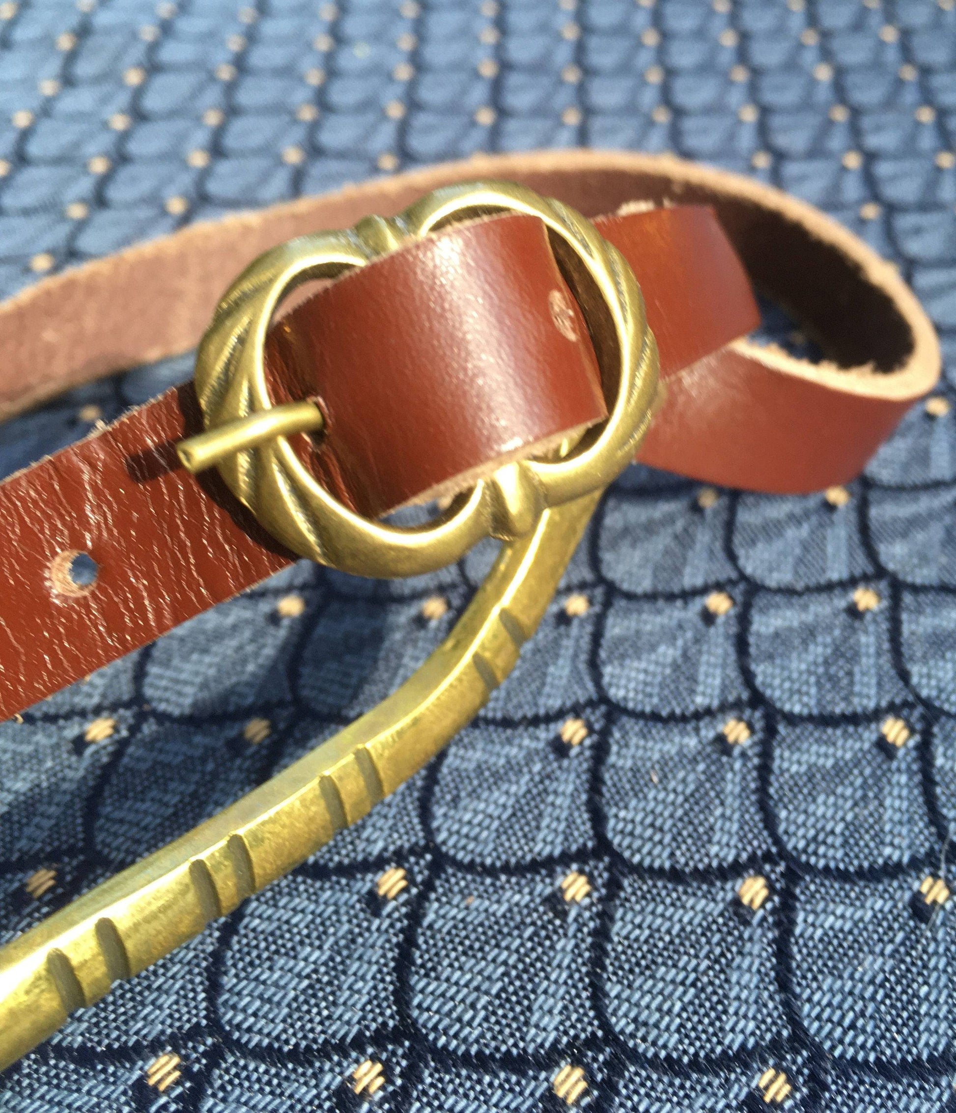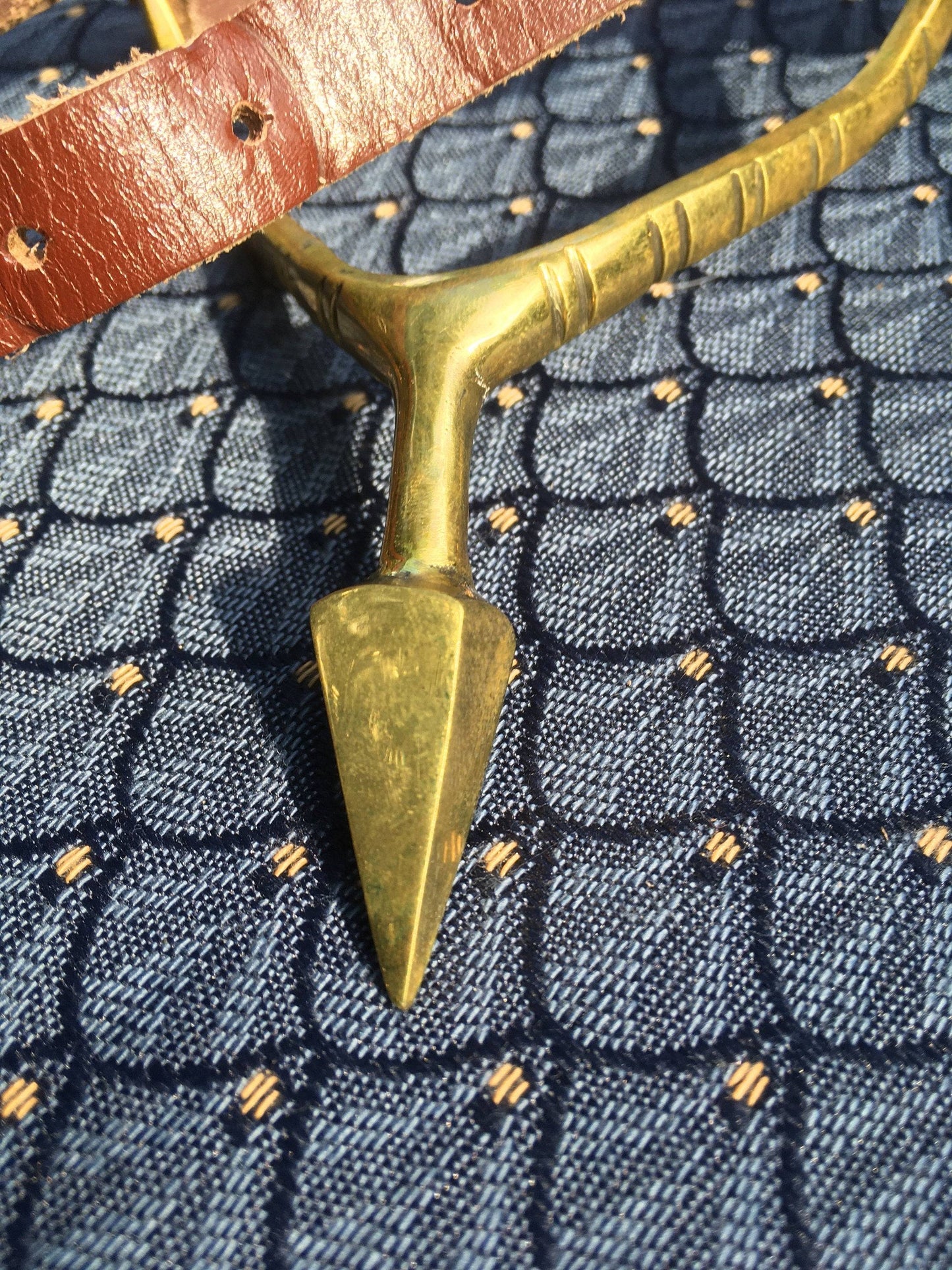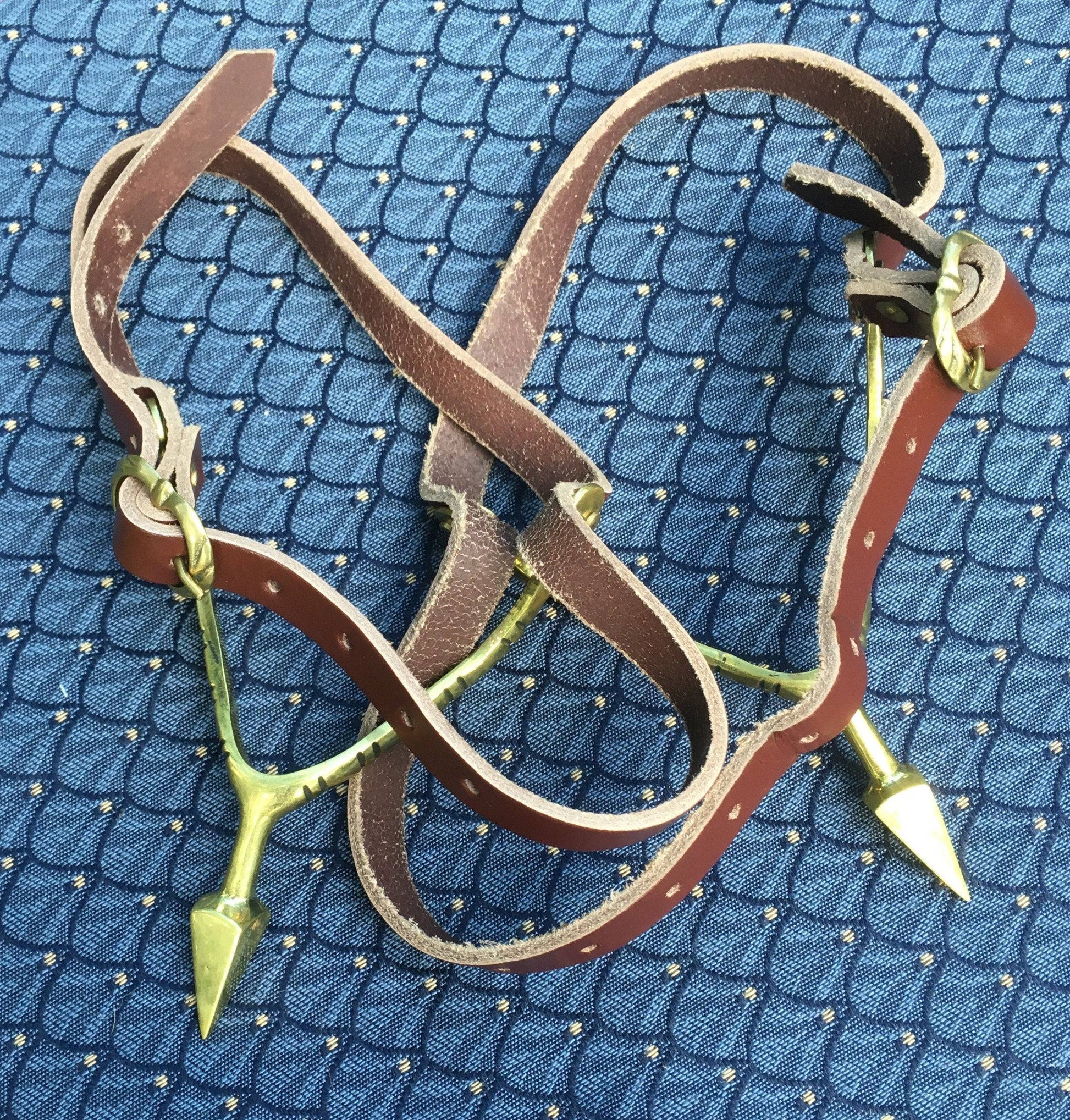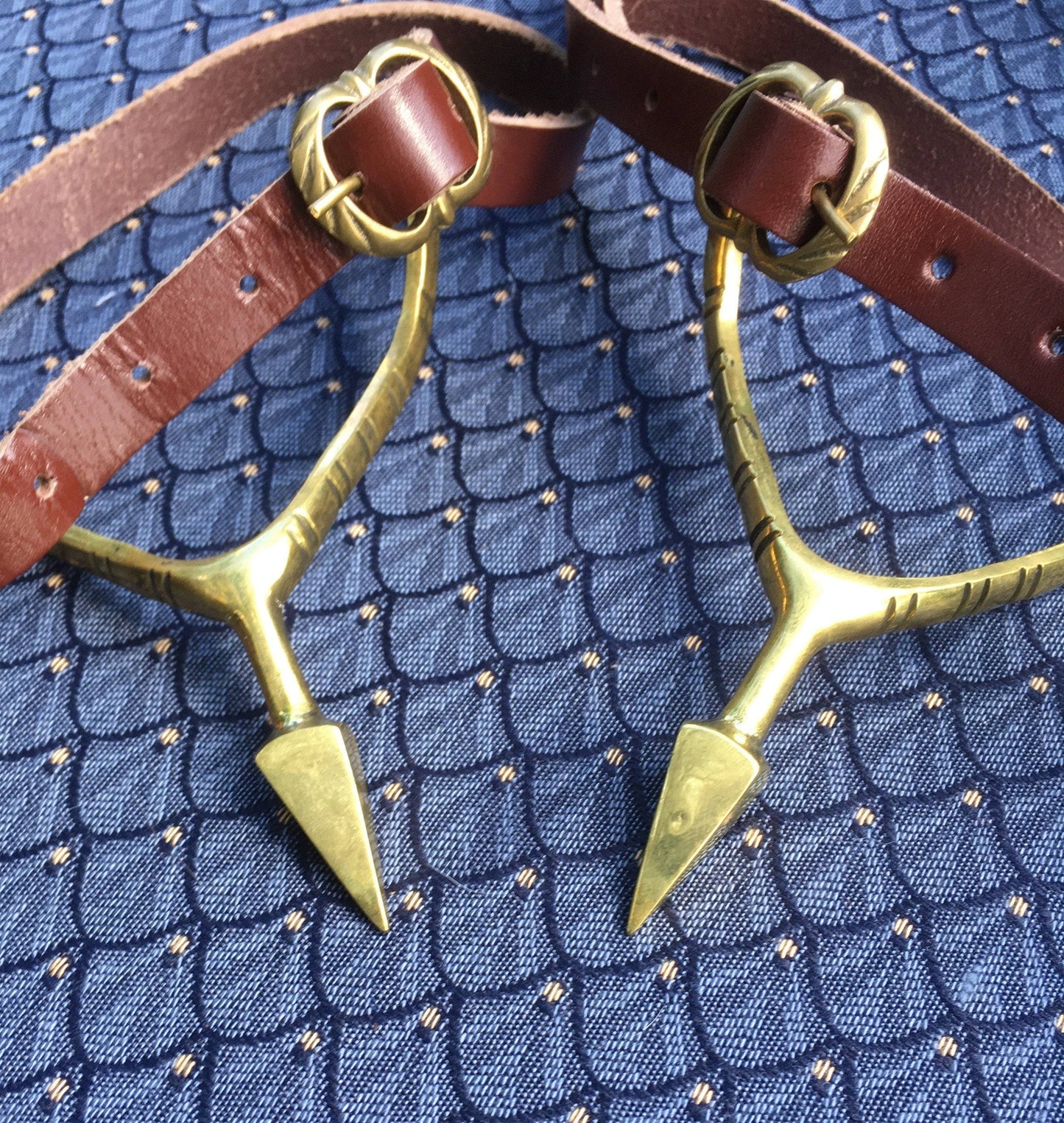 This is a complete and ready to use set made of leather and solid brass. The double strap is securely attached with brass plates to the metal spur. They fasten securely over a boot with a brass buckle. Current straps are a dark brown.