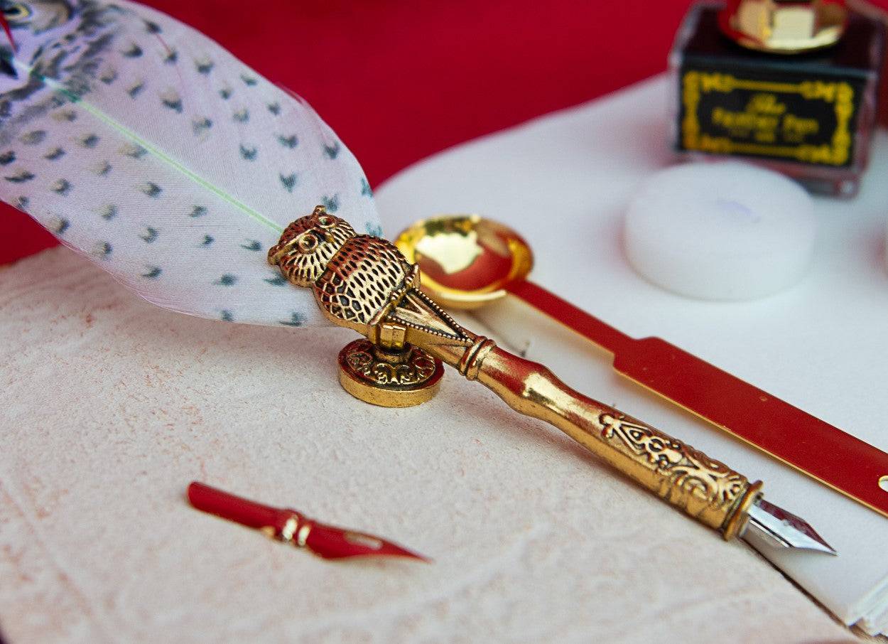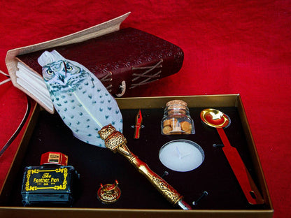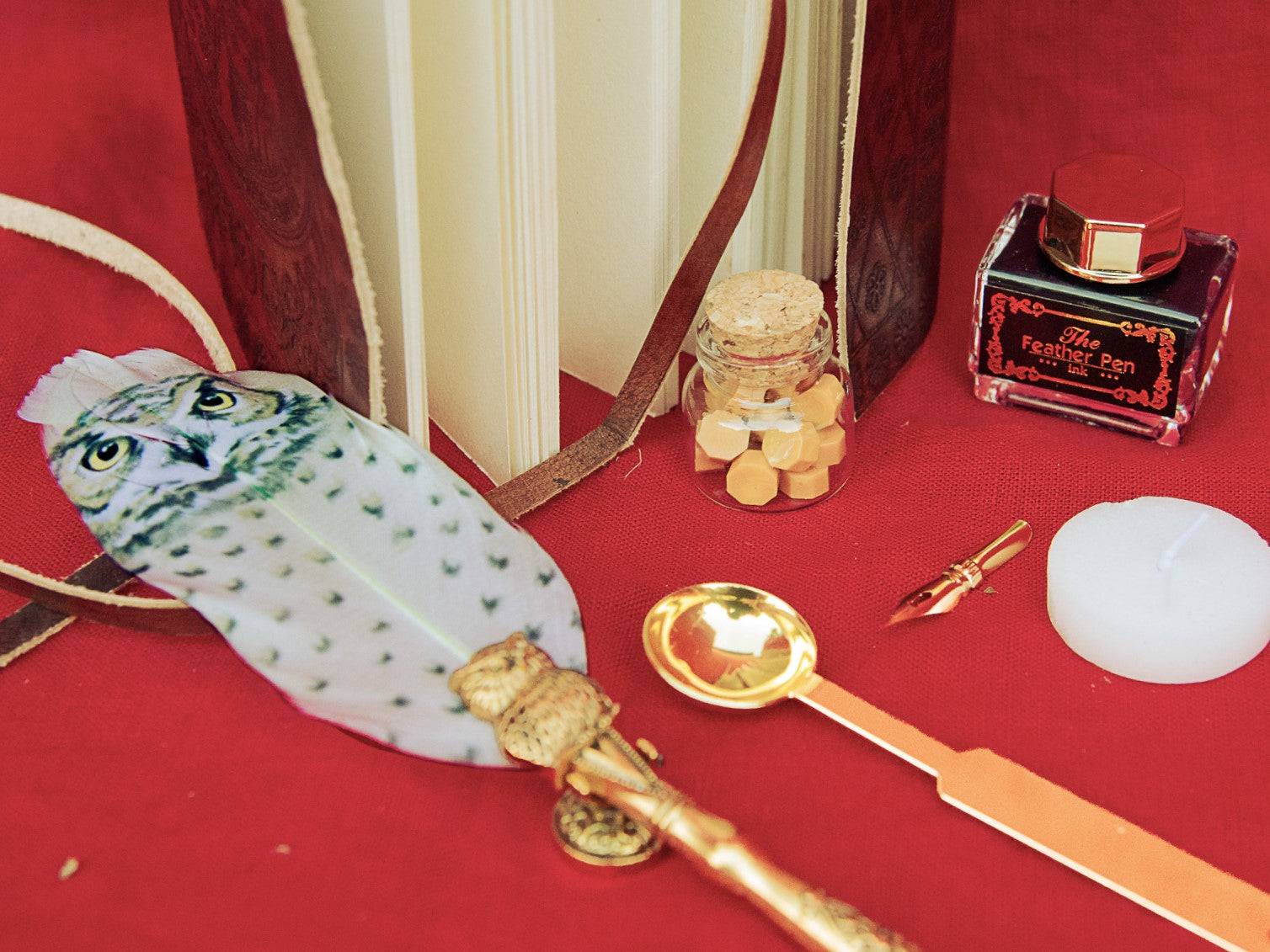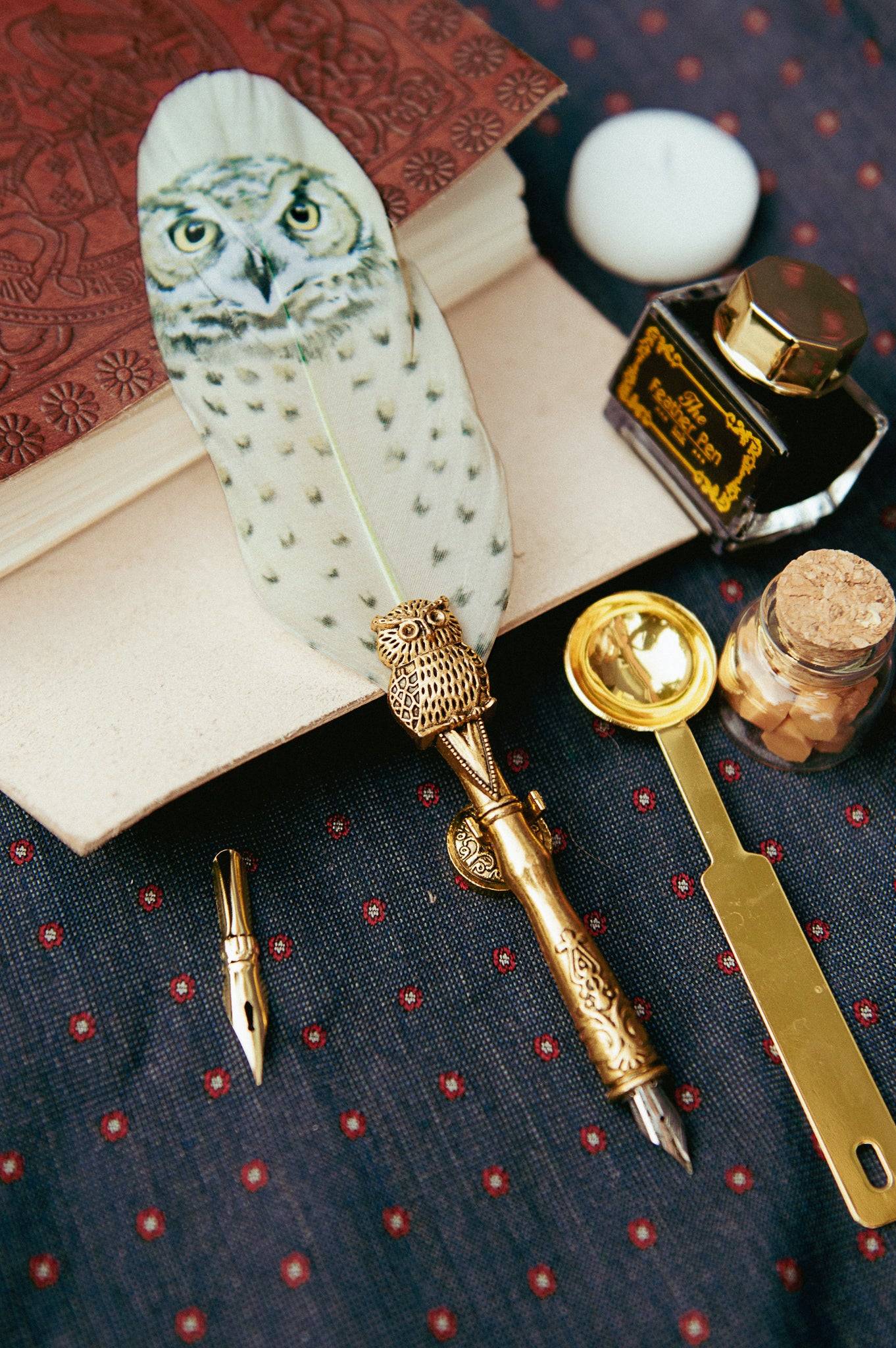 Perfect for Harry Potter fans who want a themed writing set, it features an owl sculpted on the pen shaft and printed on the genuine feather. With pure black ink, two interchangeable nibs, a Fleur-de-Lys seal and elegant golden wax, this set is one of the most unique writing accessories on the market.