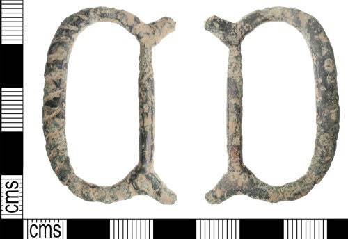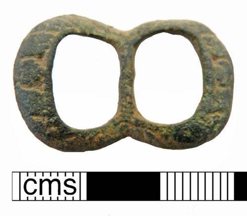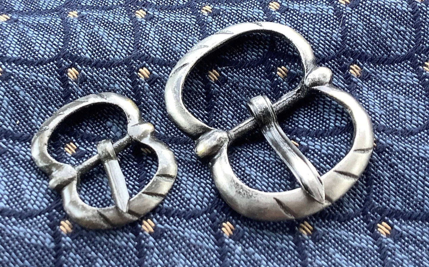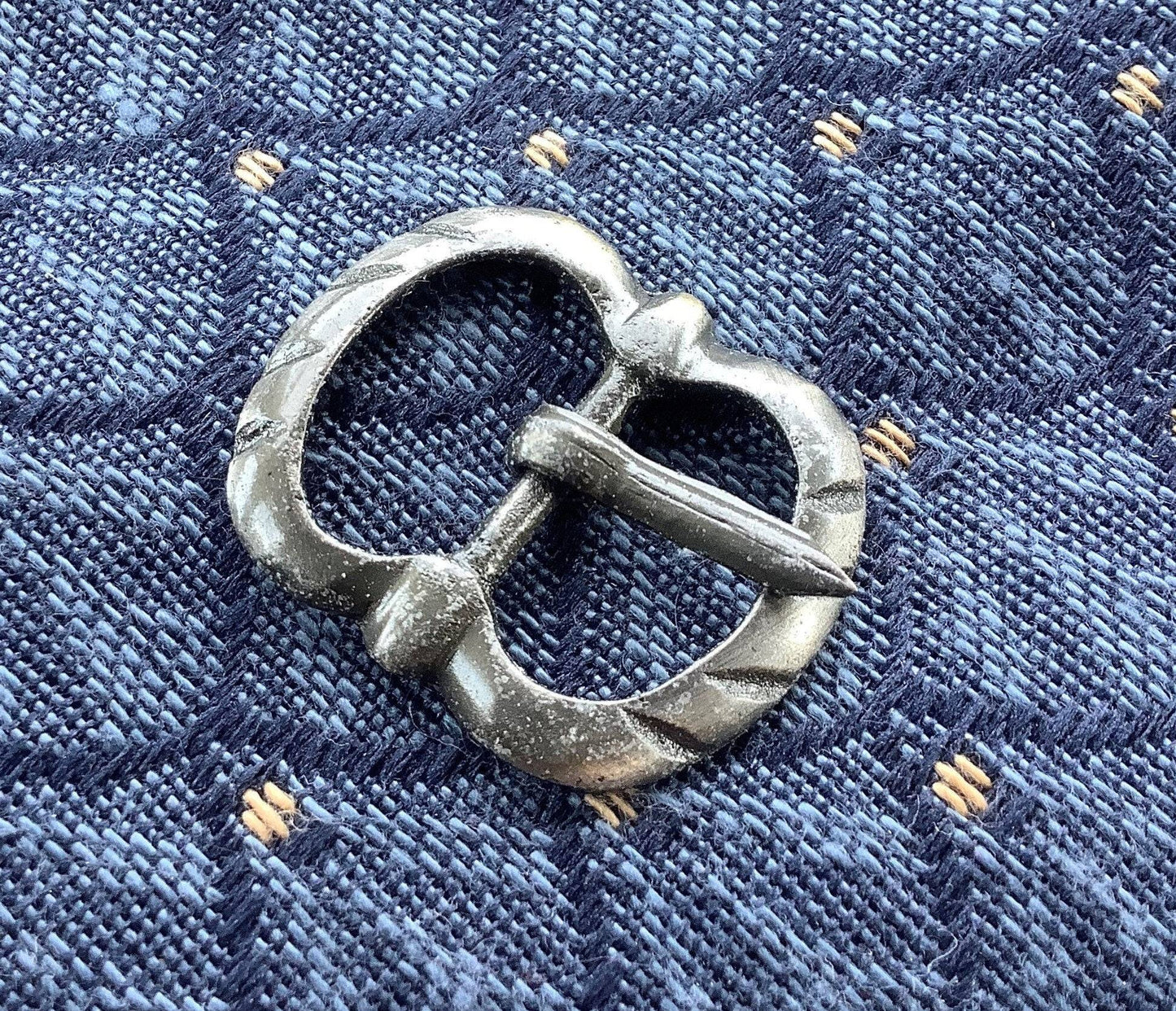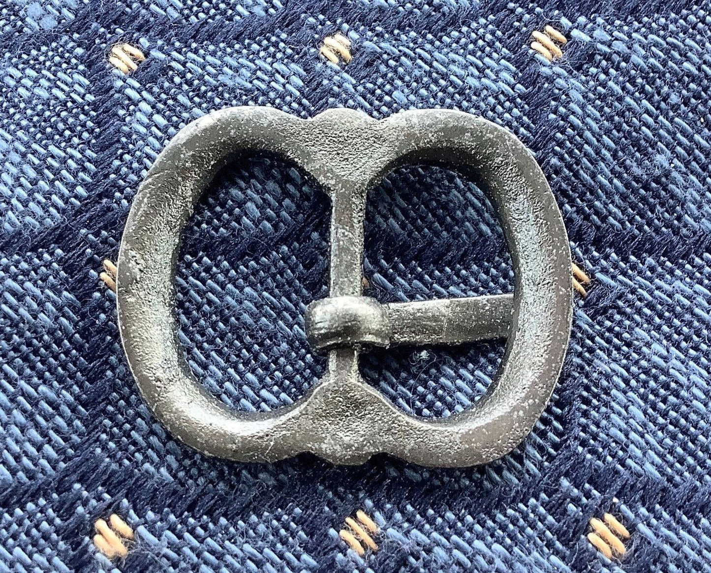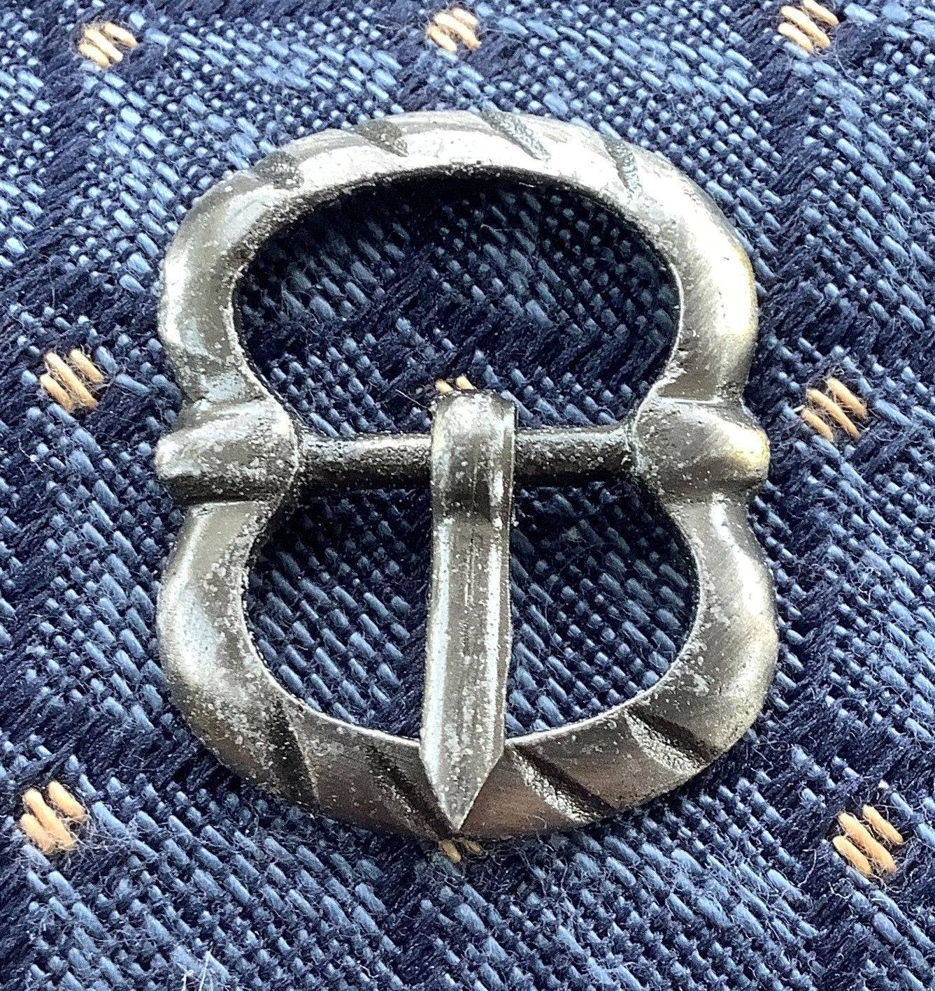 This small double buckle features a simple incised pattern along each side. It creates a rope-like appearance on each loop. It is a dark pewter colour with traces of black in the design. A has a soft shine rather than a bright sparkle.